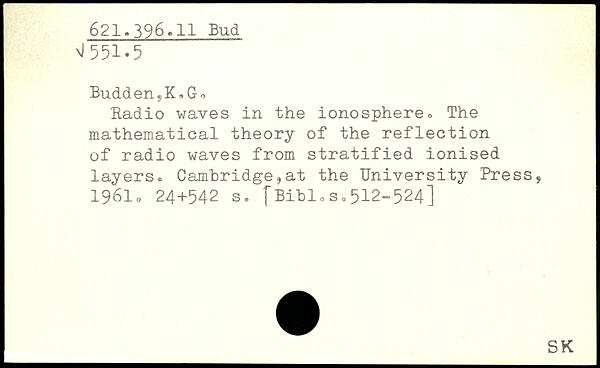 Sudden5K,Go Radio waves in the ionosphere, The mathematical theory of the reflection of radio waves from stratified ionised layers. Cambridge,at the University Press, 1961.
