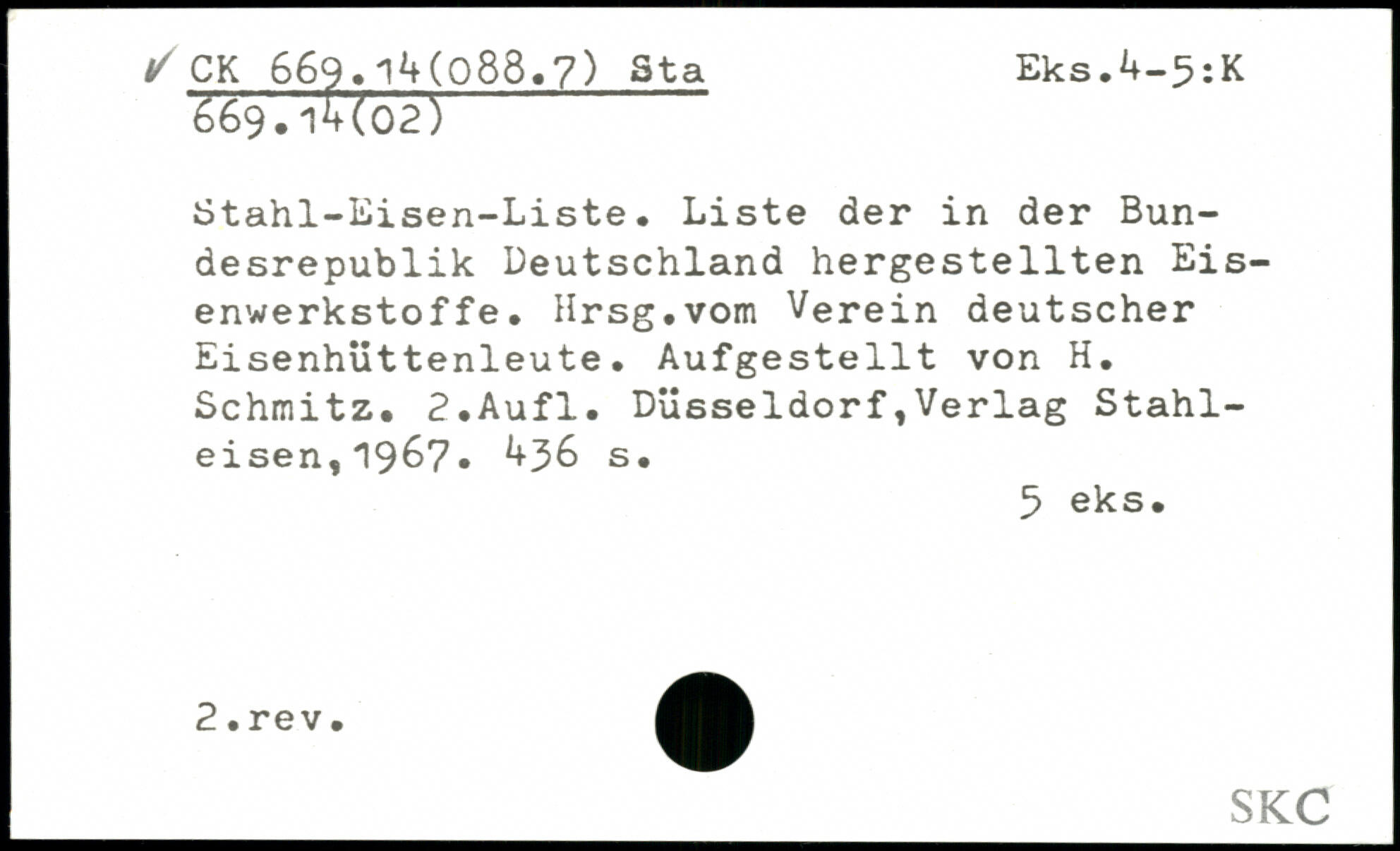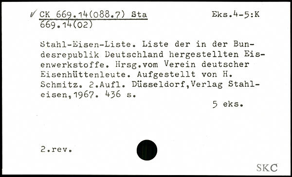 Stahl-Eisen-Liste. Liste der in der Bundesrepublik Deutschland hergestellten Eisenwerkstoffe, Hrsg,vom Verein deutscher Eisenhüttenleute. Aufgestellt von H, Schmitz, 2,Aufl.
