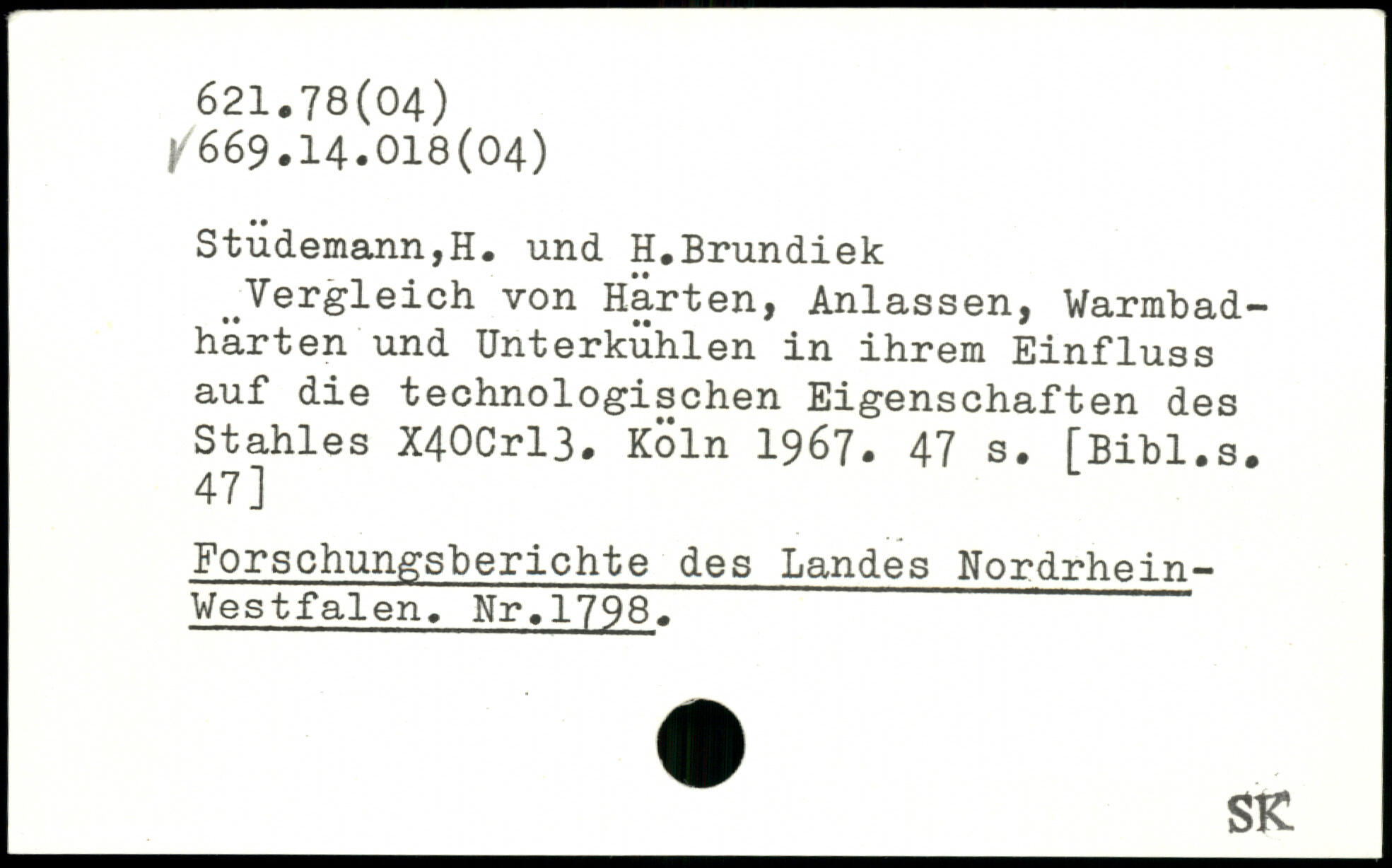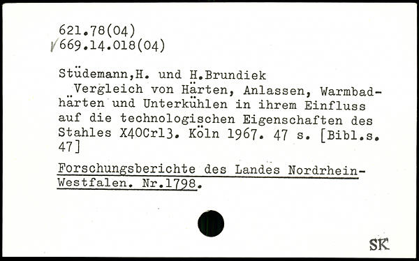 Stüdemann,H. und H.Brundiek ^Vergleich von Harten, Anlassen, Warmbadhärten und Unterkühlen in ihrem Einfluss auf die technologischen Eigenschaften des Stahles X40Crl3.