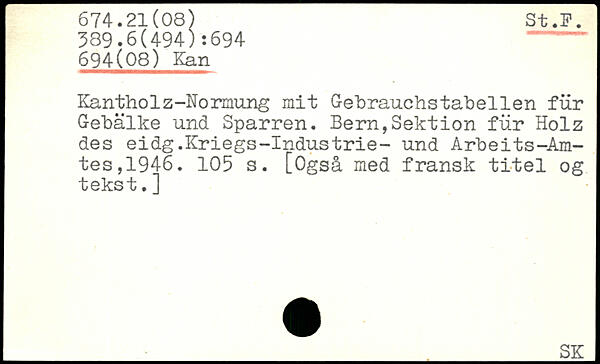 Kantholz-Normung mit Gehrauchstabellen für Gebälke und Sparren. Bern,Sektion für Holz des eidg.Kriegs-Industrie- und Arbeits-Amtes, 1946.