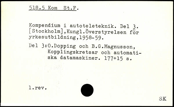 Kompendium i autoteleteknik. Del 3. [Stockholm],Kungl.Överstyrelsen för yrkesutbildning,195 8— 59- Del 3:0.Dopping och B.G.Magnusson, Kopplingskretsar och automatiska datamaskiner.