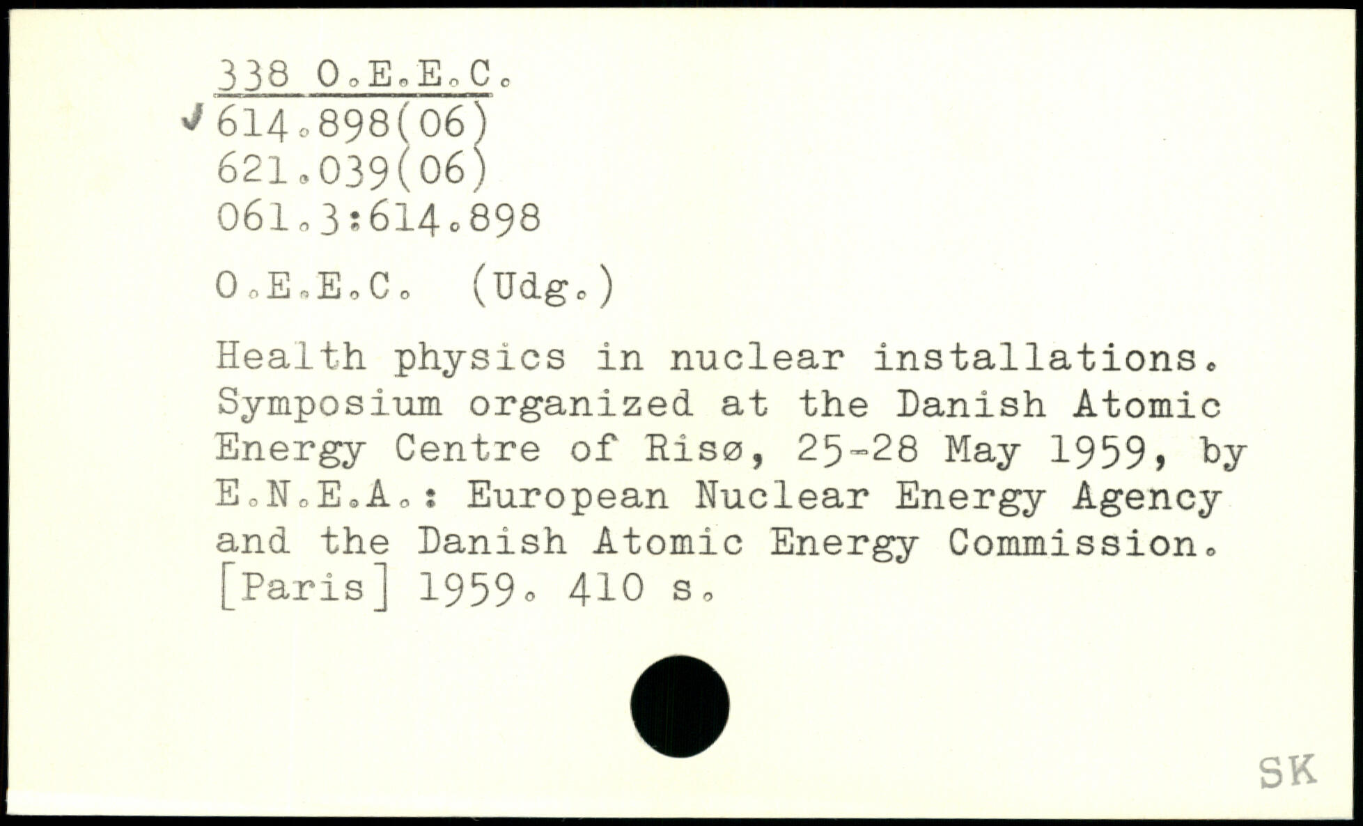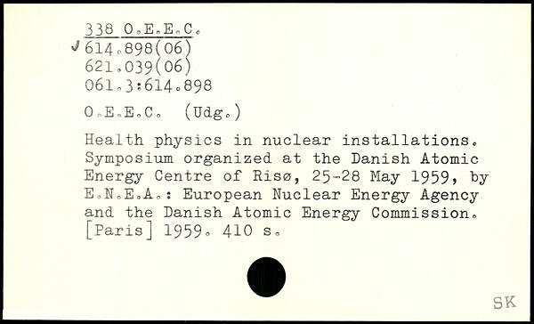 Health physics in nuclear installations. Symposium organized at the Danish Atomic Energy Centre of Rise, 25-28 May 1959, hy EcNoEoA,: European Nuclear Energy Agency and the Danish Atomic Energy Commission.