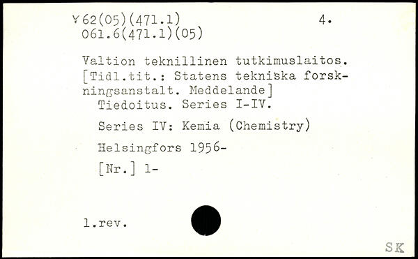 Valtion tekn1111nen tutkimuslaitos. [Tidl.tit.: Statens tekniska forskningsanstalt. Meddelande] Tiedoitus. Series I-IV. Series IV: Kemia (Chemistry)