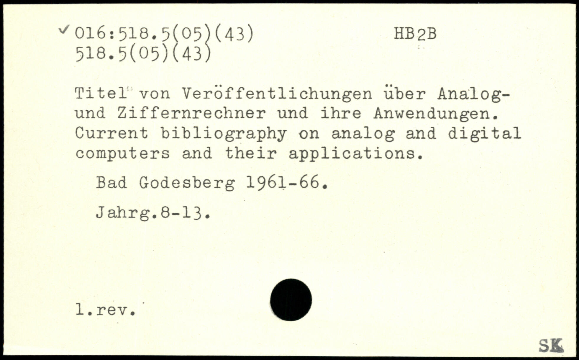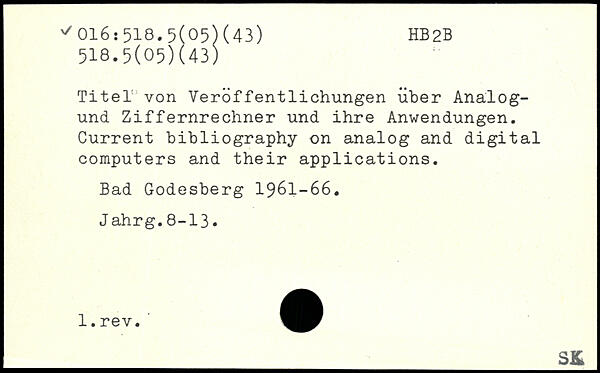 Titel' von Veröffentlichungen über Analog-und Ziffernrechner und ihre Anwendungen. Current bibliography on analog and digital Computers and their applications. Bad Godesberg 1961-66. Jahrg. 8-13.
