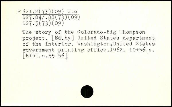 The story of the Colorado-Big Thompson project. [Ed.by] United States department of the interior. Washington,United States government printing office,1962.