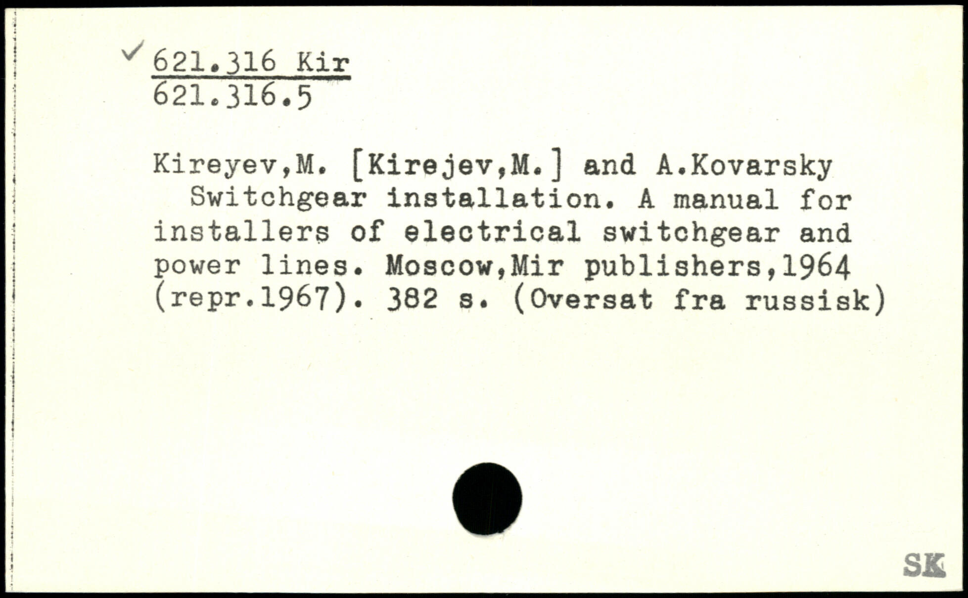 Kireyev,M. [Kirejev,M.] and A.Kovarsky Switchgear installation. A manual for installers of electrical switchgear and power lines.