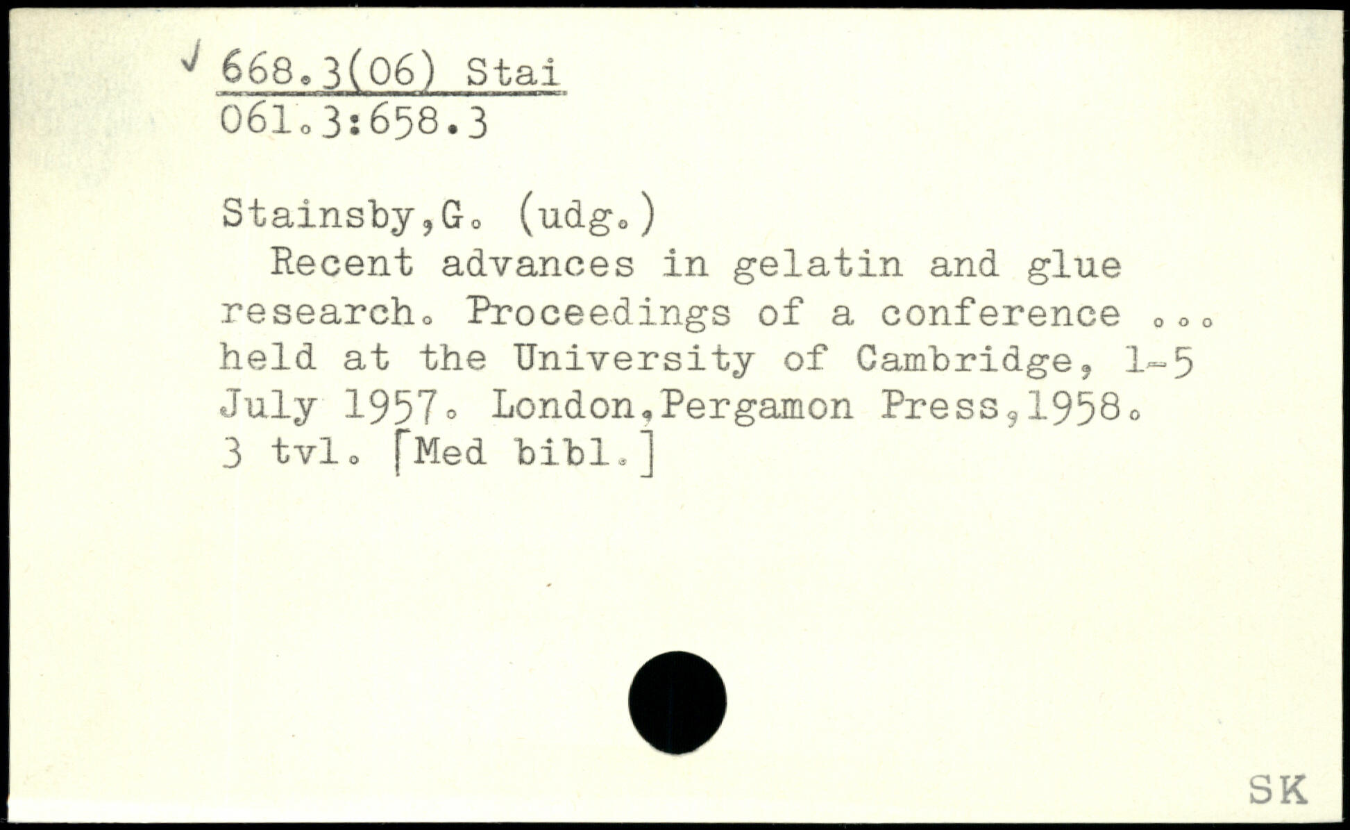 Recent advances in gelatin and glue research. Proceedings of a conference ... held at the University of Cambridge, 1-5 July 1957. London,Pergamon Press919580 3 tvl. [Med bibl,]