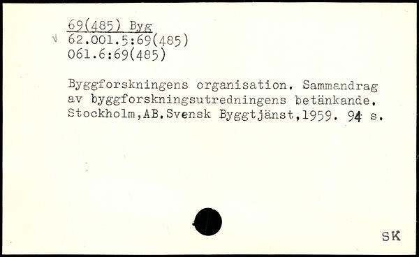 Byggforskningens organisation. Sammandrag av byggforskningsutredningens betänkande, Stockholm,AB.Svensk Byggtjänst, 1959. 94' s.