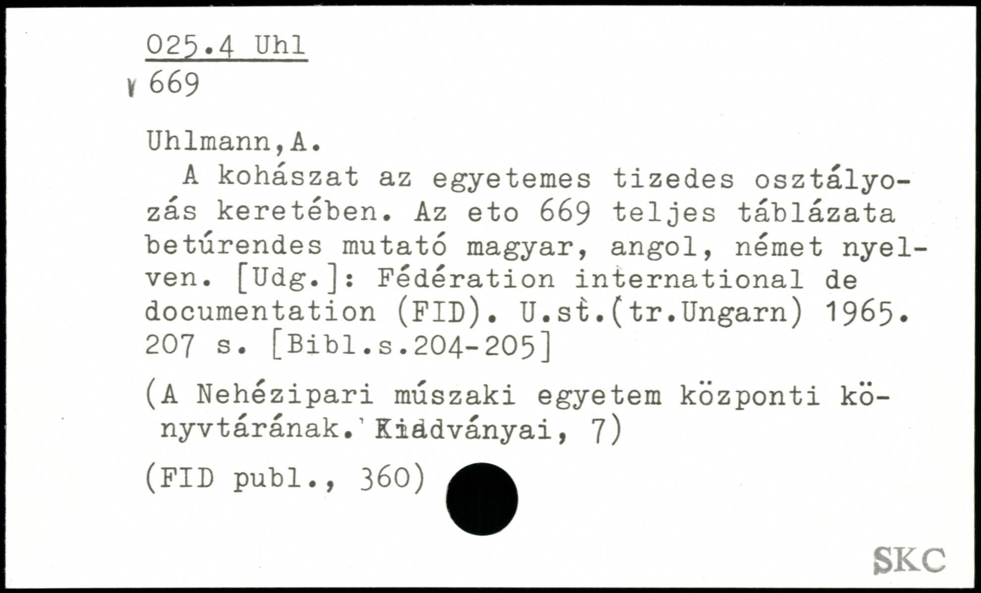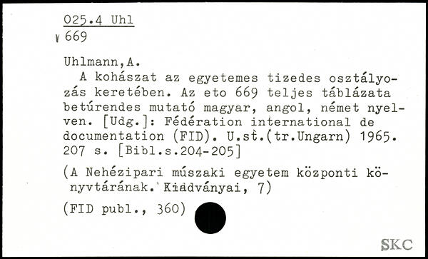 A kohaszat az egyetemes tizedes osztalyo-zâs keretében. Az eto 669 teljes tablazata beturendes mutato magyar, angol, nemet nyel-ven. [Udg.]: Federation international de documentation (FID). U.si.(tr.Ungarn) 1965