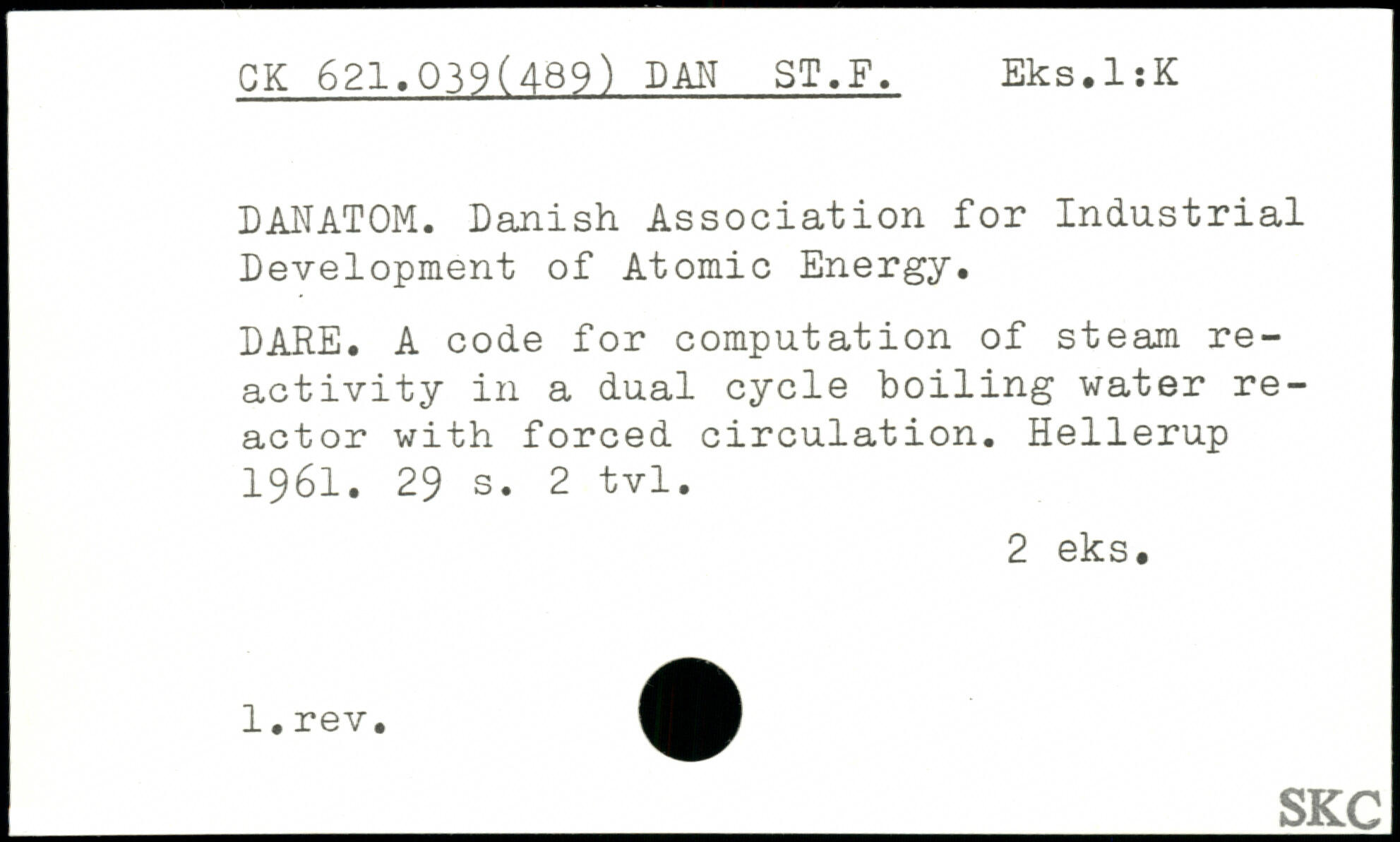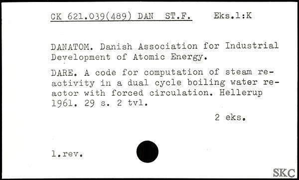 DANATOM. Danish Association for Industrial Development of Atomic Energy. DARE. A code for computation of steam reactivity in a dual cycle boiling water reactor with forced circulation. Hellerup 1961.