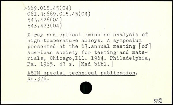X ray and optical emission analysis of high-temperature alloys. A symposium presented at the 67.annual meeting [of] American society for testing and materials, Chicago,111. 1964. Philadelphia, Pa. 1965.
