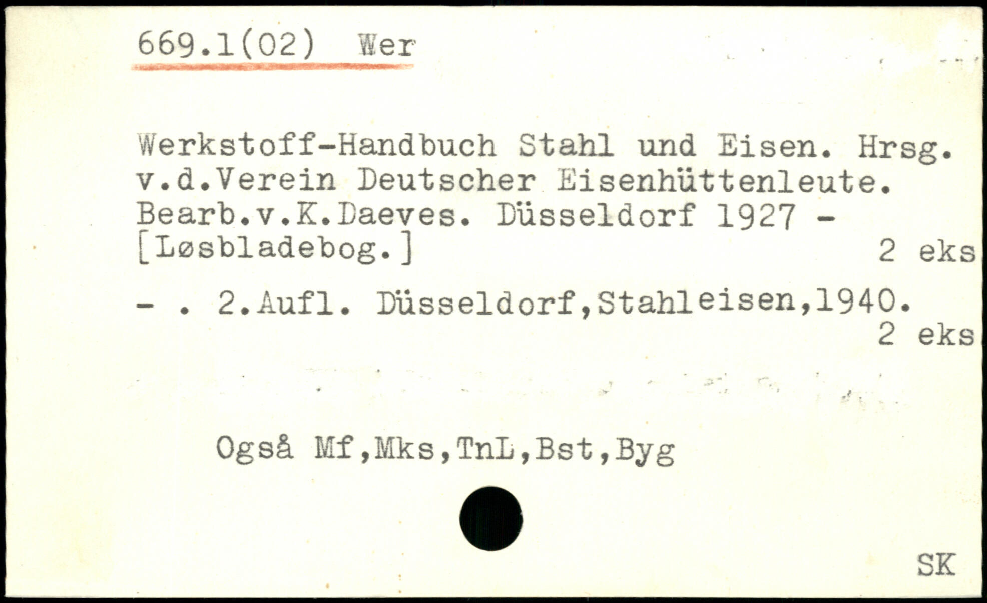 Werkstoff-Handbuch Stahl und Eisen. Hrsg, v.d.Verein Deutscher Eisenhüttenleute. Bearh.v.K.Daeves. Düsseldorf 1927 -[Losbladebog.]
