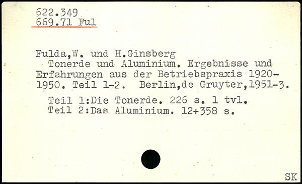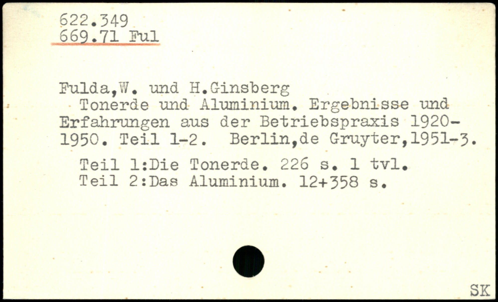Fulda,W. -und H.Ginsberg Tonerde und Aluminium. Ergebnisse und Erfahrungen aus der Betriebspraxis 1920-1950. Teil 1-2. Berlin,de Gruyter,1951-3. Teil l:Die Tonerde.