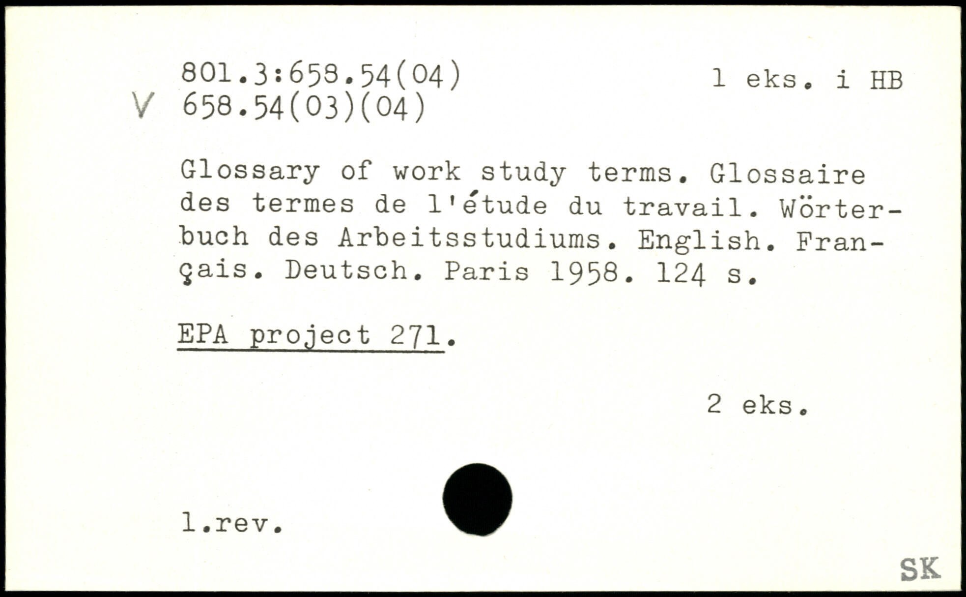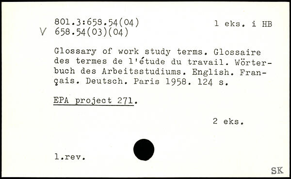 Glossary of work study terms. Glossaire des termes de l'étude du travail. Worter-Buch des Arbeitsstudiums. English. Français. Deutsch.