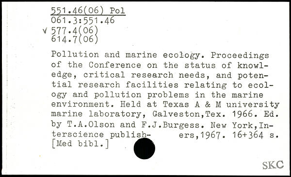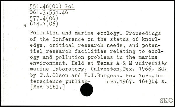 Pollution and marine ecology. Proceedings of the Conference on the status of knowledge, critical research needs, and potential research facilities relating to ecology and pollution problems in the marine environment. Held at Texas A & M university marine laboratory, Galveston,Tex. 1966. Ed. by T.A.Olson and F.J.Burgess.