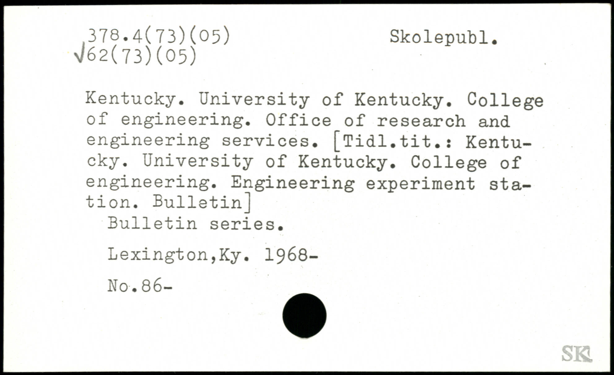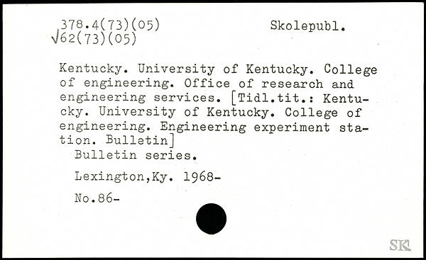 Kentucky. University of Kentucky. College of engineering. Office of research and engineering services. [Tidl.tit.: Kentucky. University of Kentucky. College of engineering. Engineering experiment station. Bulletin] Bulletin series. Lexington,Ky. 1968- No. 86-