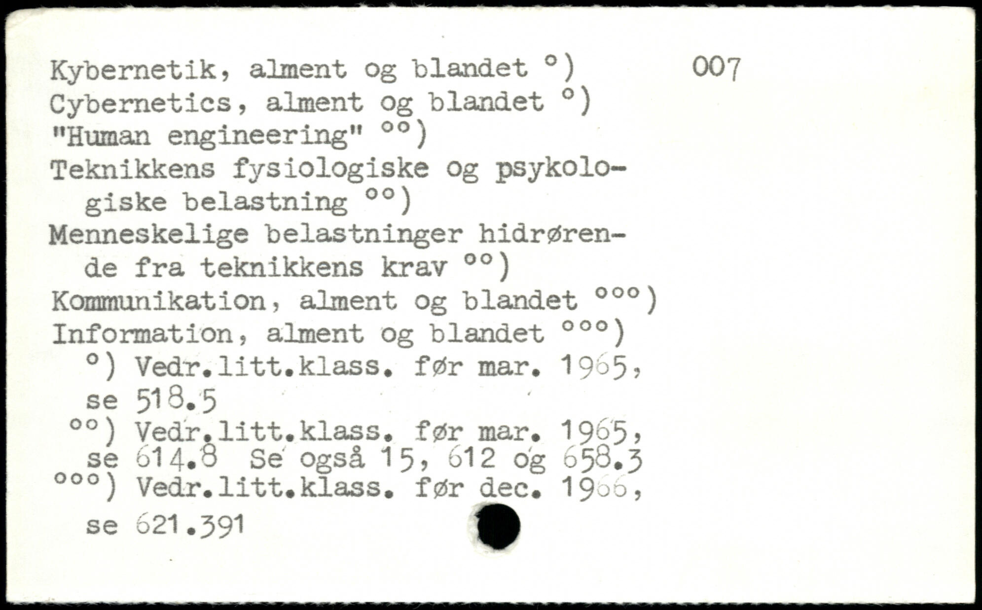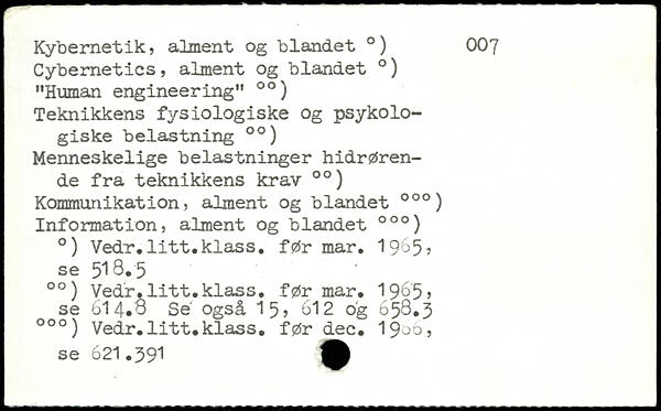 Kybernetik, alment og blandet .) 007 Cybernetics, alment og blandet .) "Human engineering" 00 ) Teknikkens fysiologiske og psykologiske belastning 00) Menneskelige belastninger hidrørende fra teknikkens krav 00) Kommunikation, alment og blandet 000) Information, alment og blandet 000) .) Vedr.litt.klass. før mar. 19^5? se 518.5 00) Vedr.litt.klass. før mar. 1965, se 614.