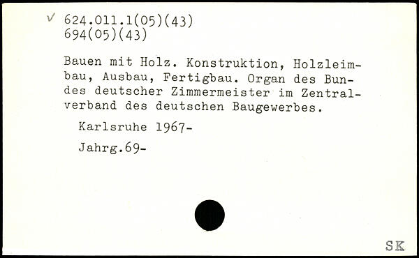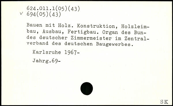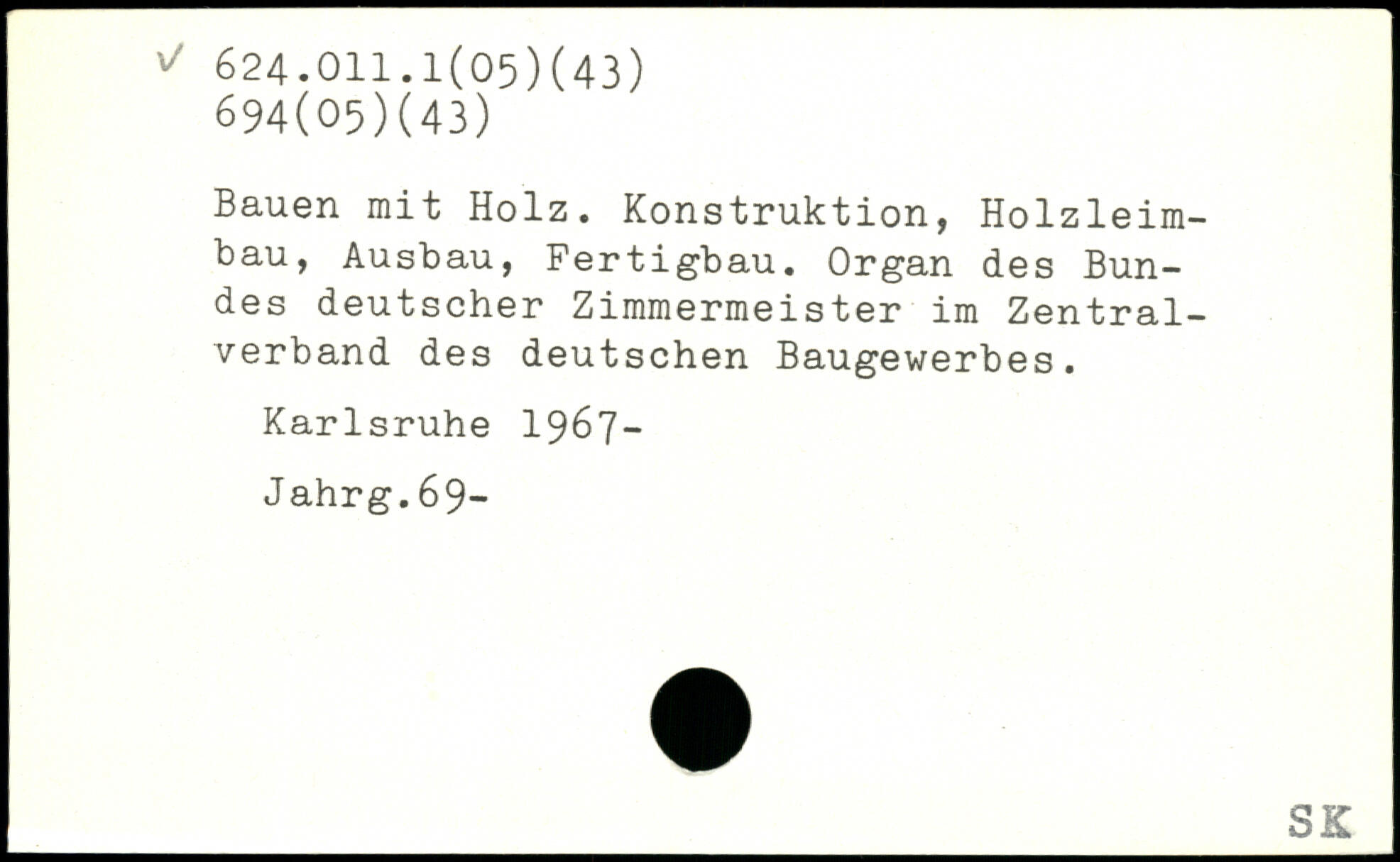 Bauen mit Holz. Konstruktion, Holzleimbau, Ausbau, Fertigbau. Organ des Bundes deutscher Zimmermeister im Zentralverband des deutschen Baugewerbes. Karlsruhe 196 7 — Jahrg.69-