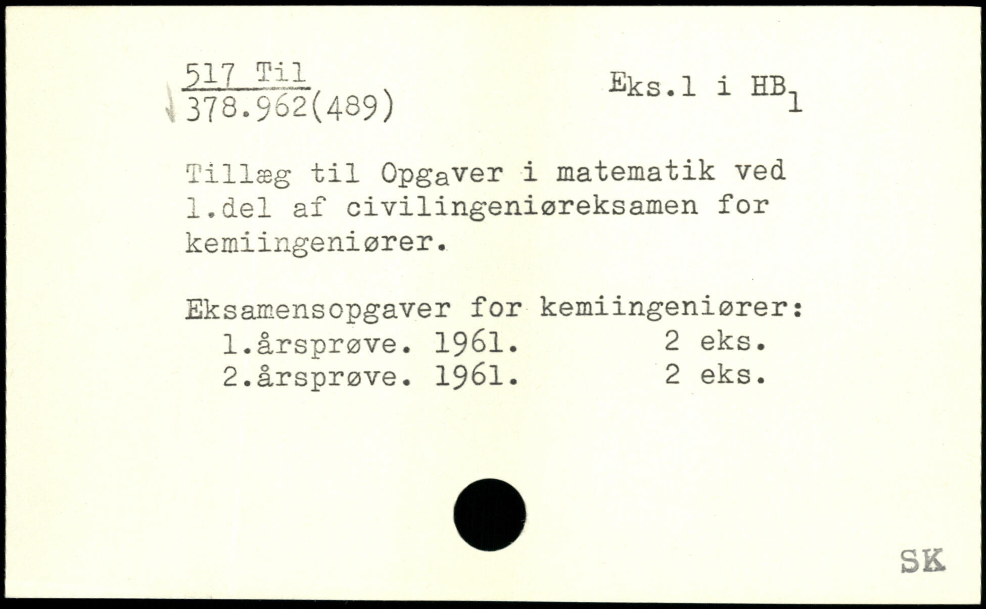 Tillæg til Opgaver i matematik ved l.del af civilingeniøreksamen for kemiingeniører. Eksamensopgaver for kemiingeniører: 1. årsprøve. 1961. 2 eks. 2. årsprøve. 1961. 2 eks.