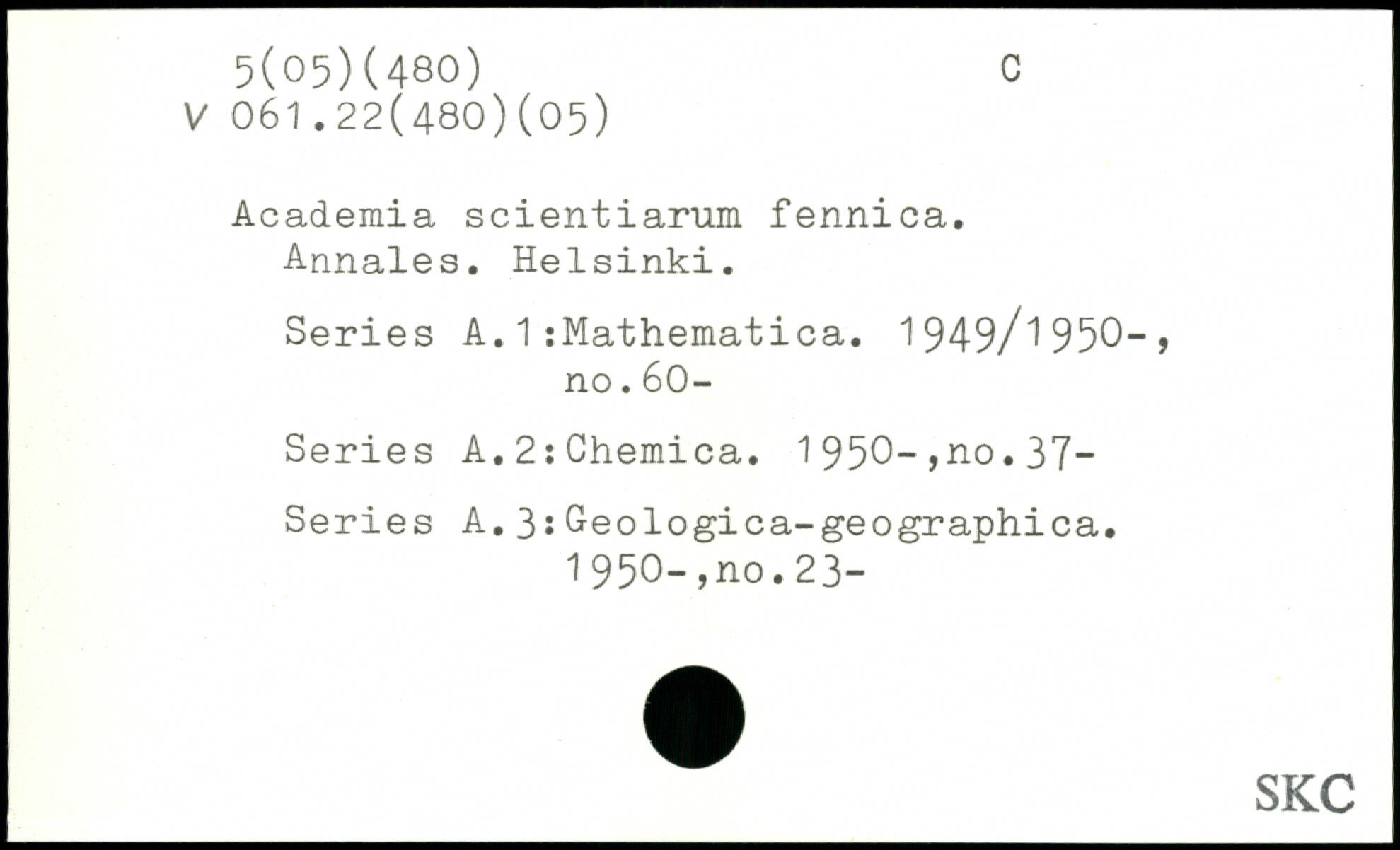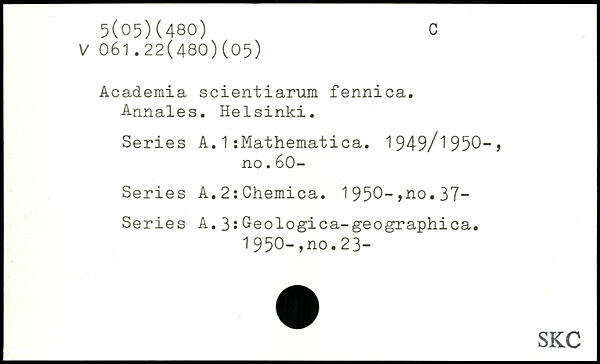 Academia scientiarum fennica. Annales. Helsinki. Series A.1:Mathematica. 1949/1950-, no.60- Series A.2:Chemica. 1950-,no.37- Series A.3:Geologica-geographica. 1950-,no.23-