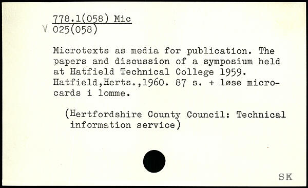 Microtexts as media for publication. The papers and discussion of a symposium held at Hatfield Technical College 1959