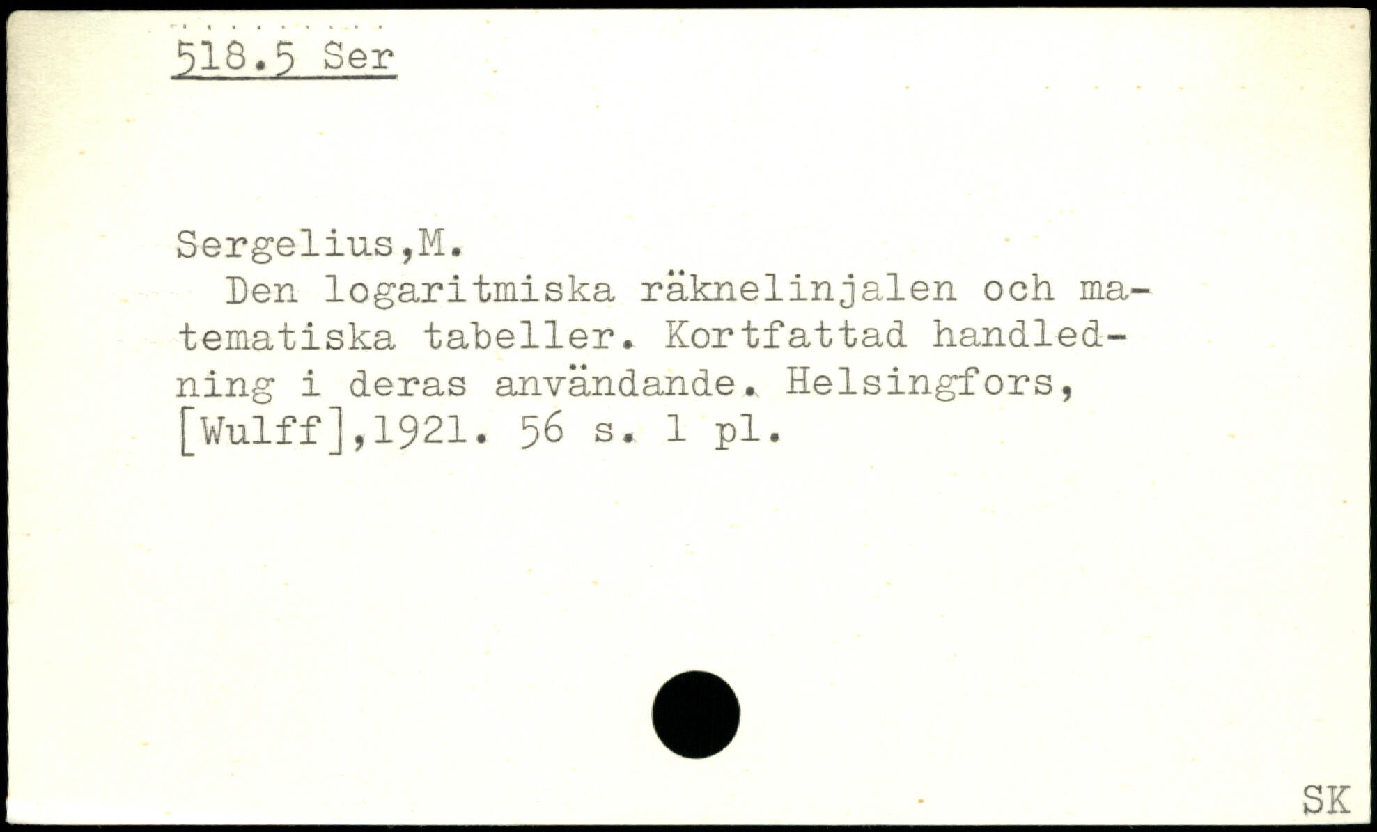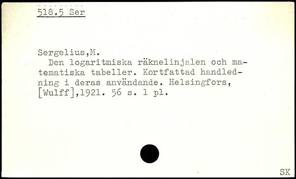 Den logaritmiska räknelinjalen och matematiska tabeller. Kortfattad handledning i deras användande. Helsingfors, [Wulff],1921.
