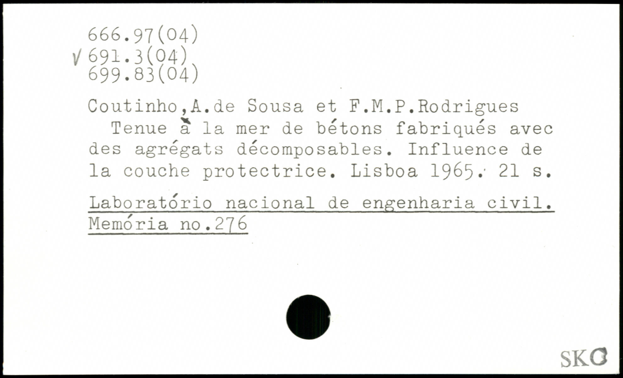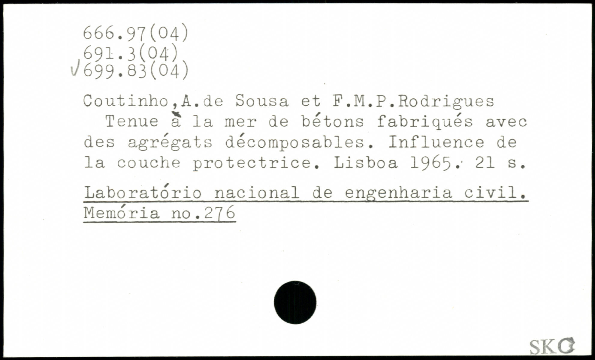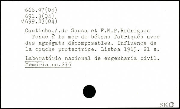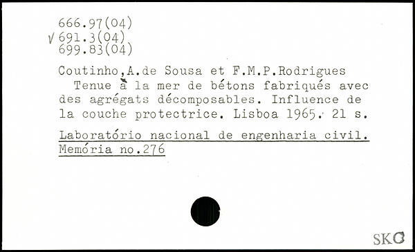 Coutinho,A.de Sousa et F.M.P.Rodrigues Tenue a la mer de bétons fabriqués avec des agrégats décomposables. Influence de la couche protectrice. Lisboa 1965.'