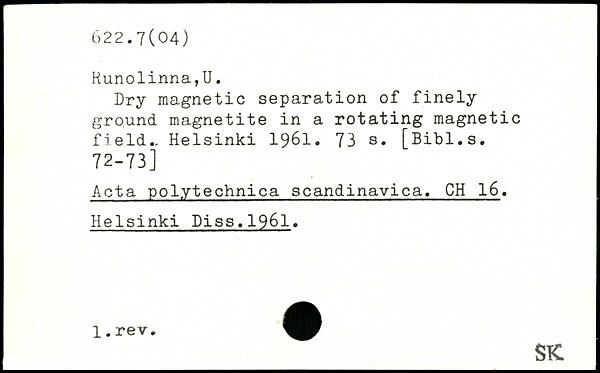 Dry magnetic separation of finely ground magnetite in a rotating magnetic field..