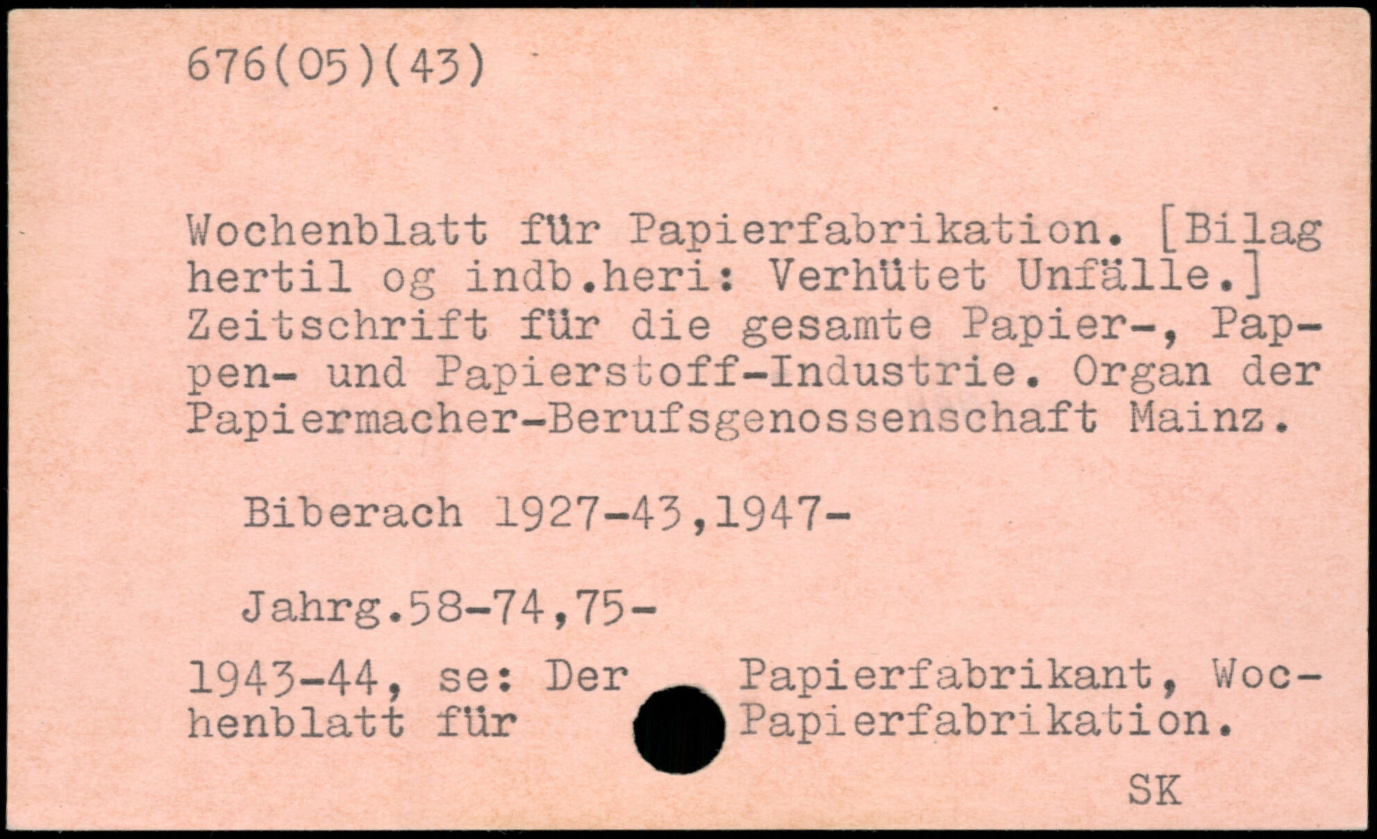 Wochenblatt für Papierfabrikation, [Bilag hertil og indb.heri: Verhütet Unfälle,] Zeitschrift für die gesamte Papier-, Pappen- und Papierstoff-Industrie. Organ der Papiermacher-Berufsgenossenschaft Mainz. Biberach 1927-43,1947- Jahrg.58-74,75- 1943-44, se: DerPapierfabrikant, Wochenblatt für Papierfabrikation.