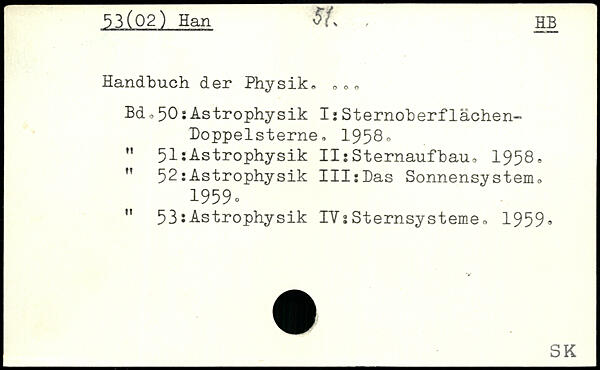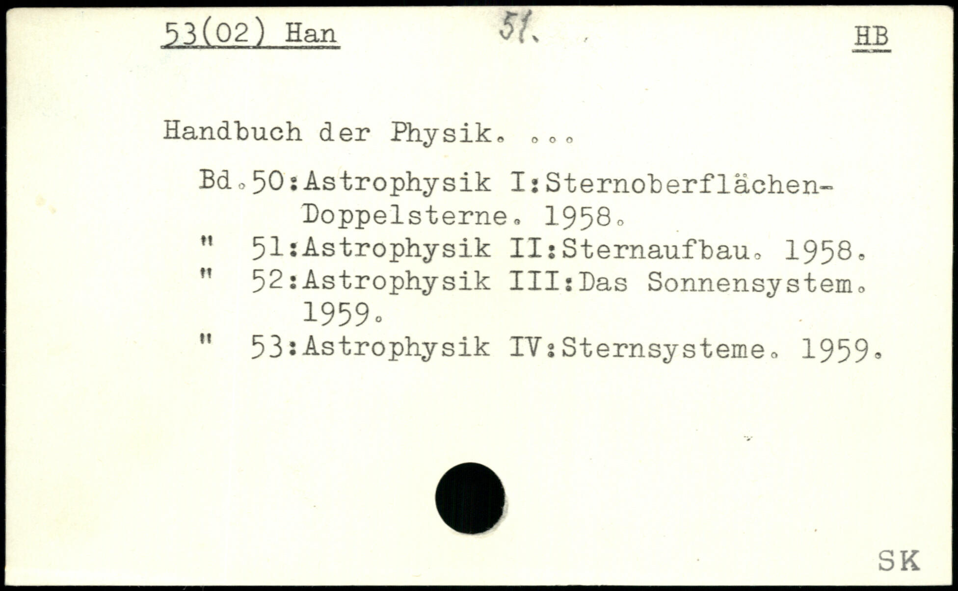 Handbuch der Physik, , ,, Bdo50:Astrophysik I:Sternoberflächen-Boppelsterne, 1958. " 51:Astrophysik II:Sternaufbau, 1958, f1 52:Astrophysik III:Bas Sonnensystem, 1959. " 53:Astrophysik IV:Sternsysteme, 1959