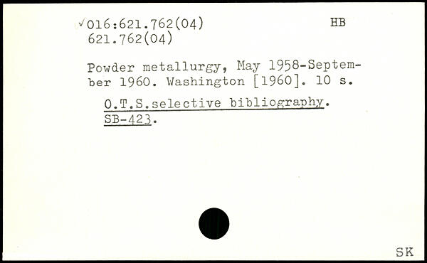 Powder metallurgy, May 1958-Septem-ber 1960.