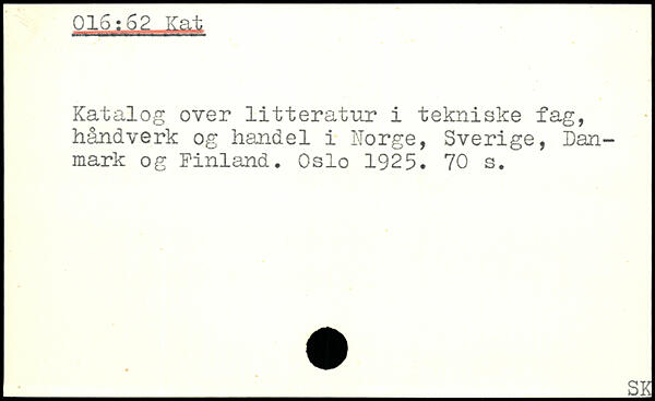 Katalog over litteratur i tekniske fag, håndverk og handel i Norge, Sverige, Danmark og Finland. Oslo 1925.