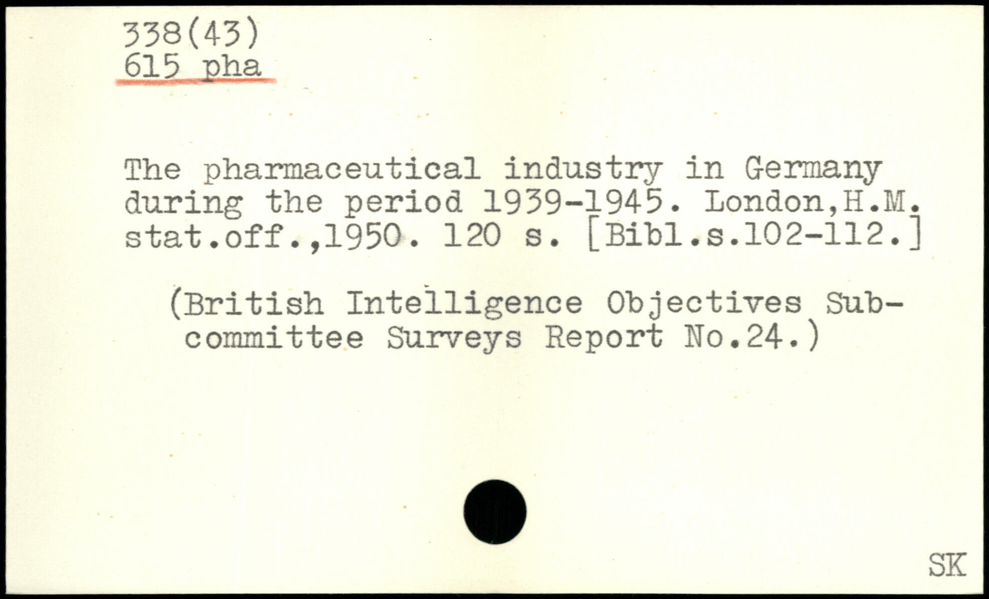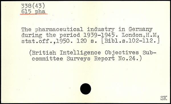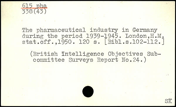 The pharmaceutical industry in Germany during the period 1939-1945. London,H.M. stat.off.,1950.