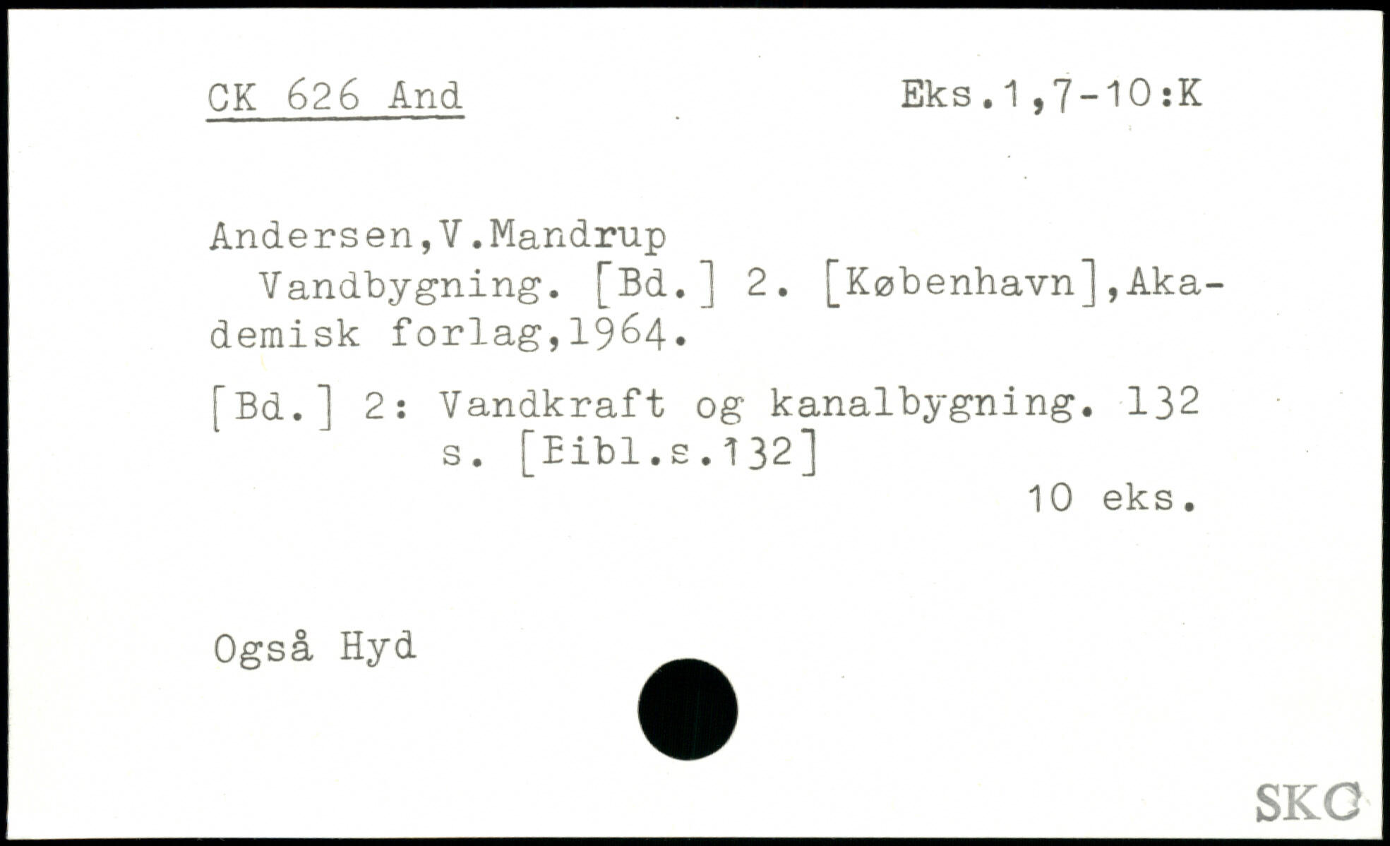 Andersen,V.Mandrup Vandbygning. [Bd.] 2. [København],Akademisk forlag,1964, [Bd.] 2: Vandkraft og kanalbygning.