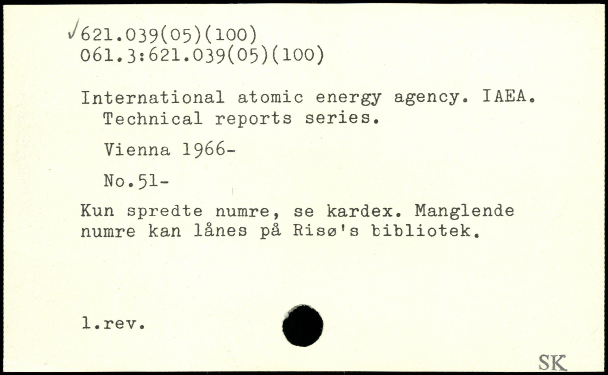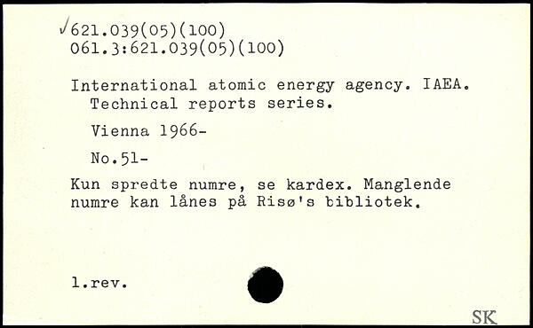 International atomic energy agency. IAEA. Technical reports series. Vienna 1966- No. 51- Kun spredte numre, se kardex. Manglende numre kan lånes på Risø’s "bibliotek.