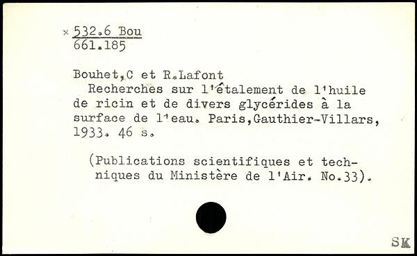 Bouhet,C et E,Lafont Eecherch.es sur l1'étalement de l1 huile de ricin et de divers glycerides à la surface de l^eau.