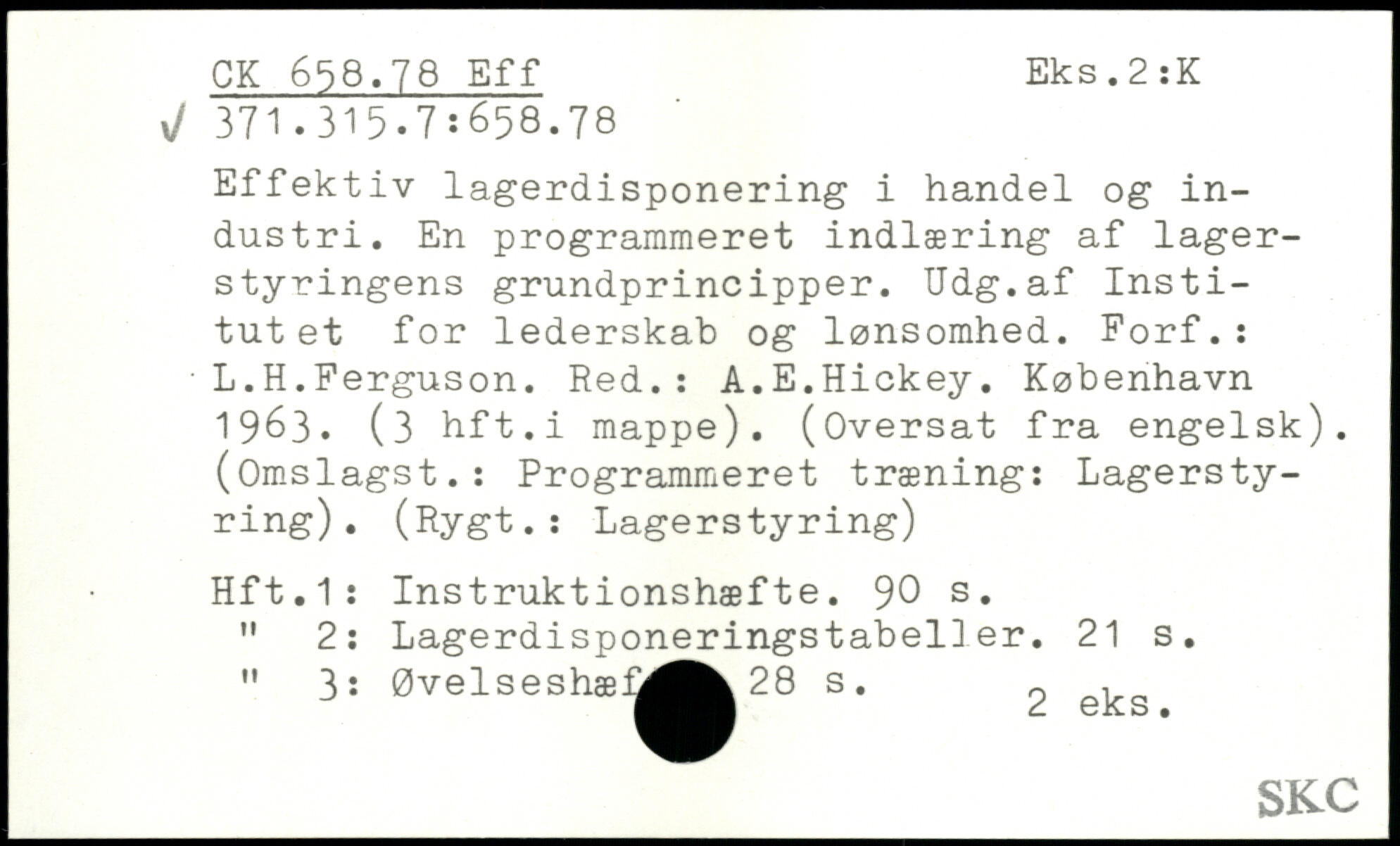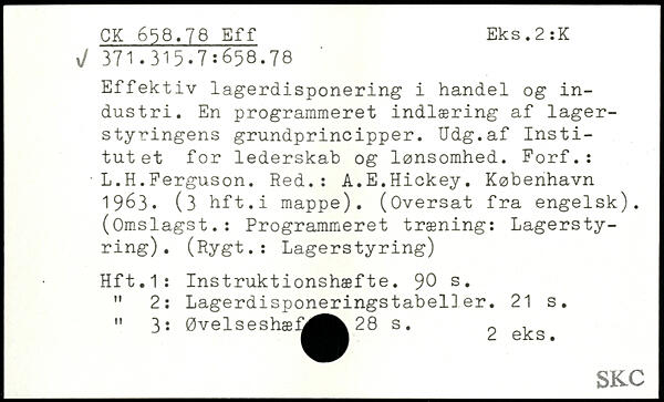 Effektiv lagerdisponering i handel og industri. En programmeret indlæring af lagerstyringens grundprincipper. Udg.af Institut et for lederskab og lønsomhed. Forf.: L.H.Ferguson. Red.: A.E.Hickey.