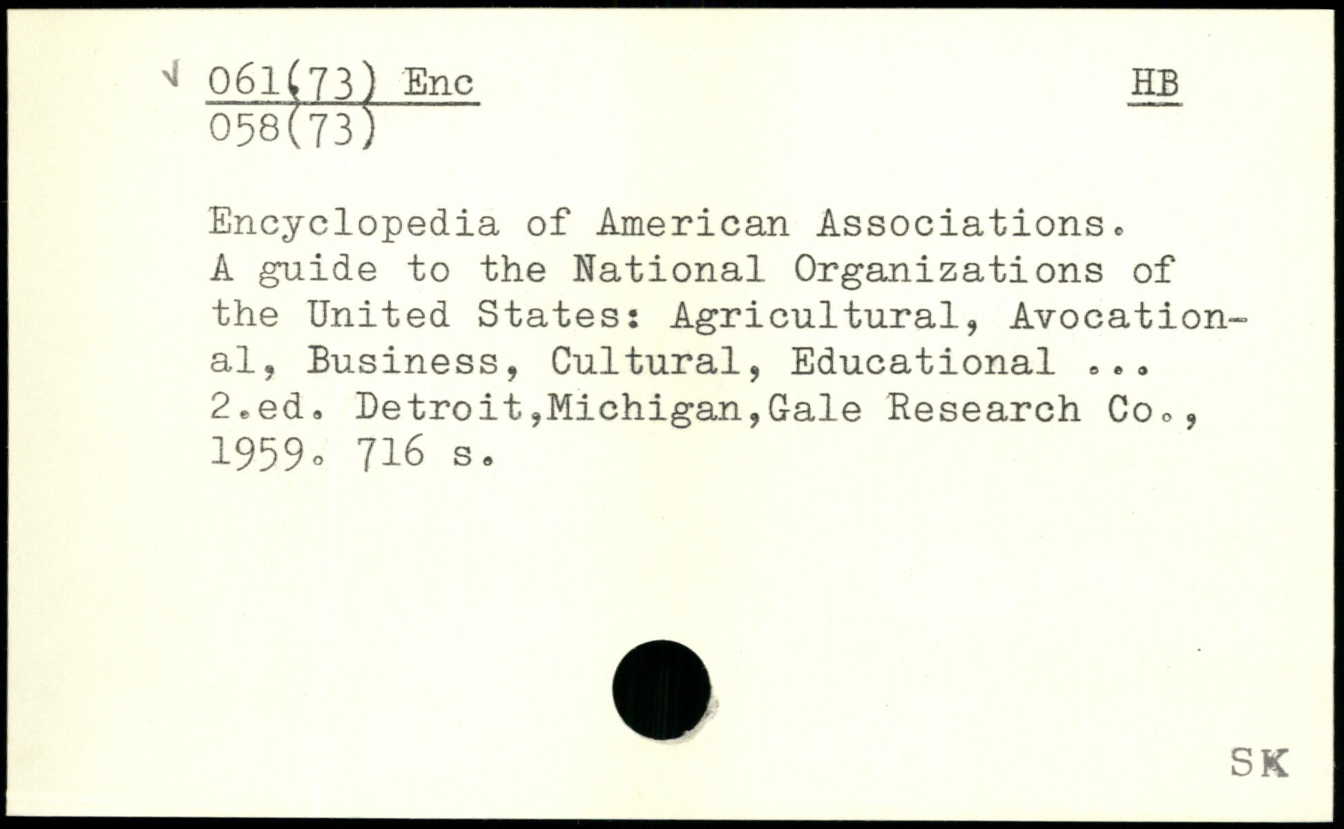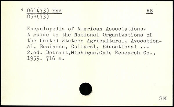 Encyclopedia of American Associations, A guide to the National Organizations of the United States: Agricultural, Avocation-al, Business, Cultural, Educational ... 2,eda Detroit,Michigan,Gale Research Co0, 1959o