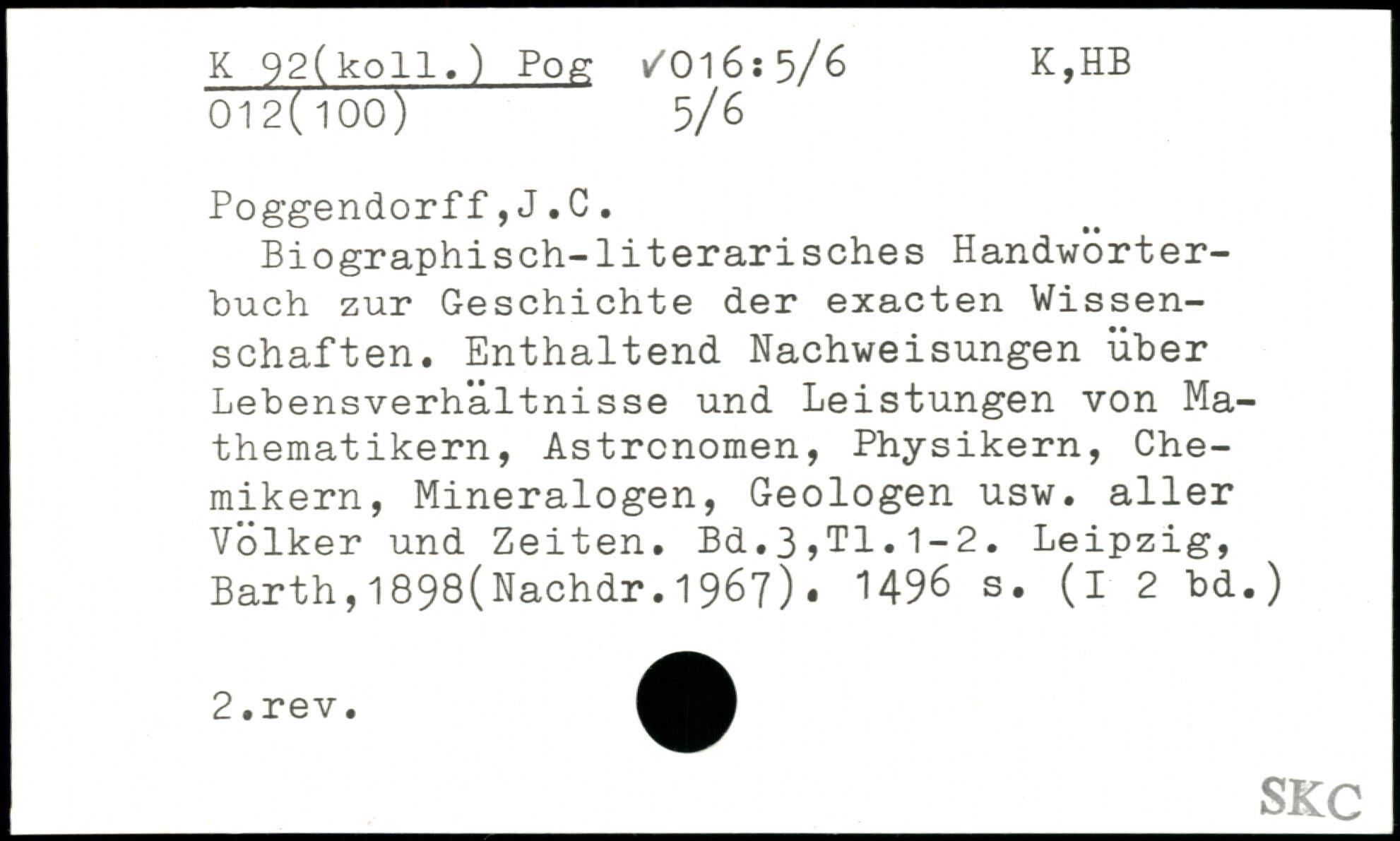 Biographisch-literarisches Handwörterbuch zur Geschichte der exacten Wissenschaften. Enthaltend Nachweisungen über Lebensverhaltnisse und Leistungen von Mathematikern, Astronomen, Physikern, Chemikern, Mineralogen, Geologen usw. aller Völker und Zeiten.