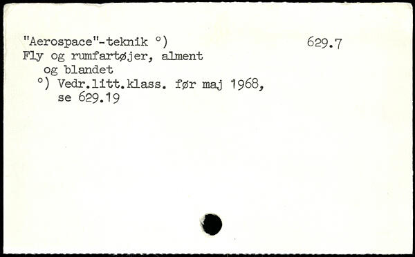 "Aerospace"-teknik .) 629.7 Fly og rumfartøjer, alment og blandet .) Vedr.litt.klass. før maj 1968, se 629.19