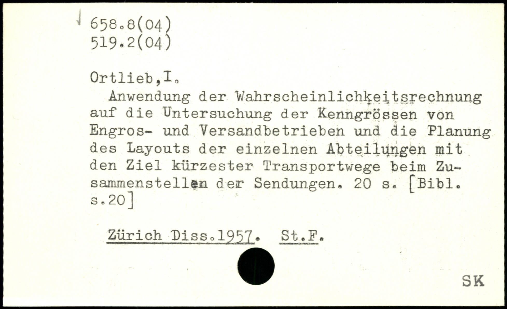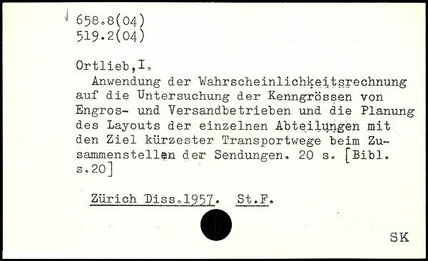 Anwendung der Wahrscheinlichkeitsrechnung auf die Untersuchung der Kenngrössen von Engros- und Versandbetrieben und die Planung des Layouts der einzelnen Abteilimgen mit den Ziel kürzester Transportwege beim Zusammenstellen der Sendungen.