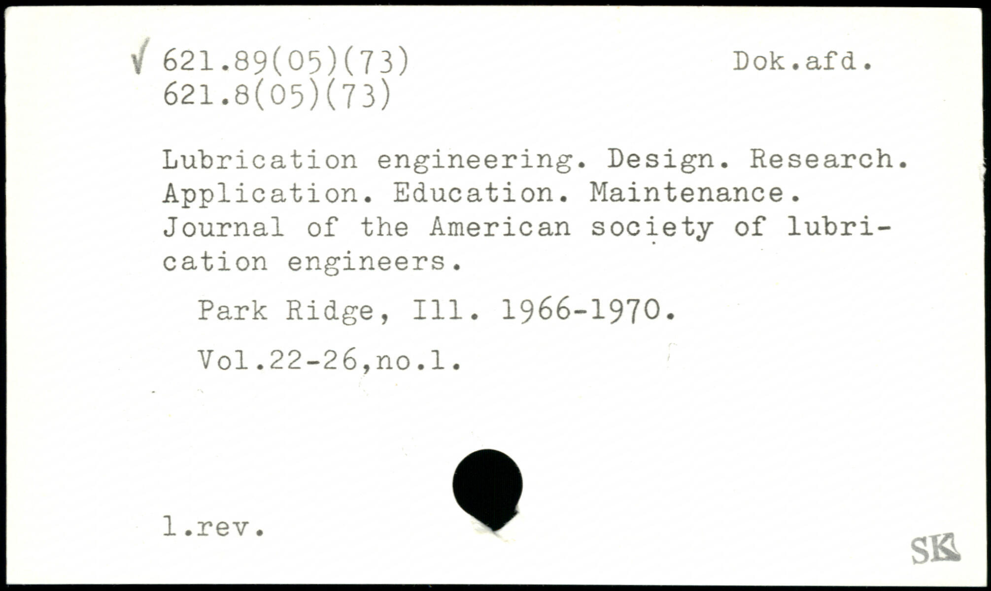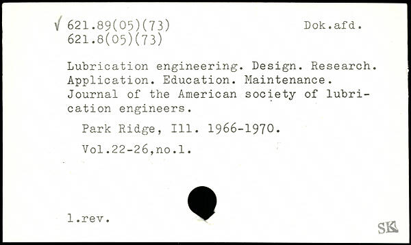 Lubrication engineering. Design. Research. Application. Education. Maintenance. Journal of the American society of lubrication engineers. Park Ridge, 111. 1966-1970, Yol.22-26,no.1. s K.