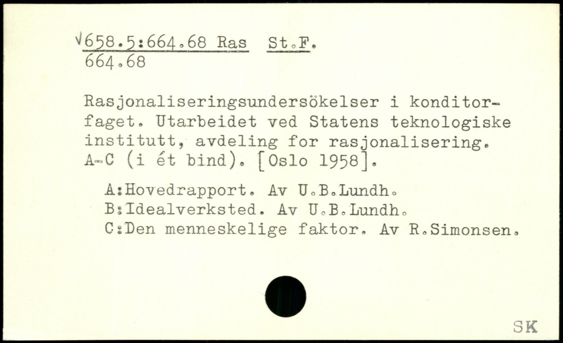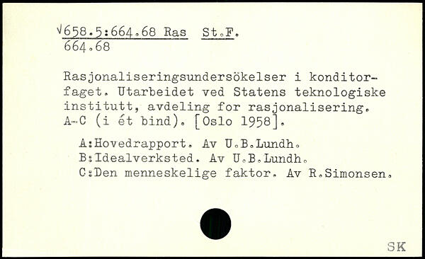 Rasjonaliseringsundersokelser i konditorfaget. Utarbeidet ved Statens teknologiske institutt, avdeling for rasjonalisering. A-C (i ét bind). [Oslo 1958], A1Hovedrapport. Av U.B.Lundho Bsldealverksted. Av UoB.Lundhu C sLen menneskelige faktor. Av R,Simonsen.