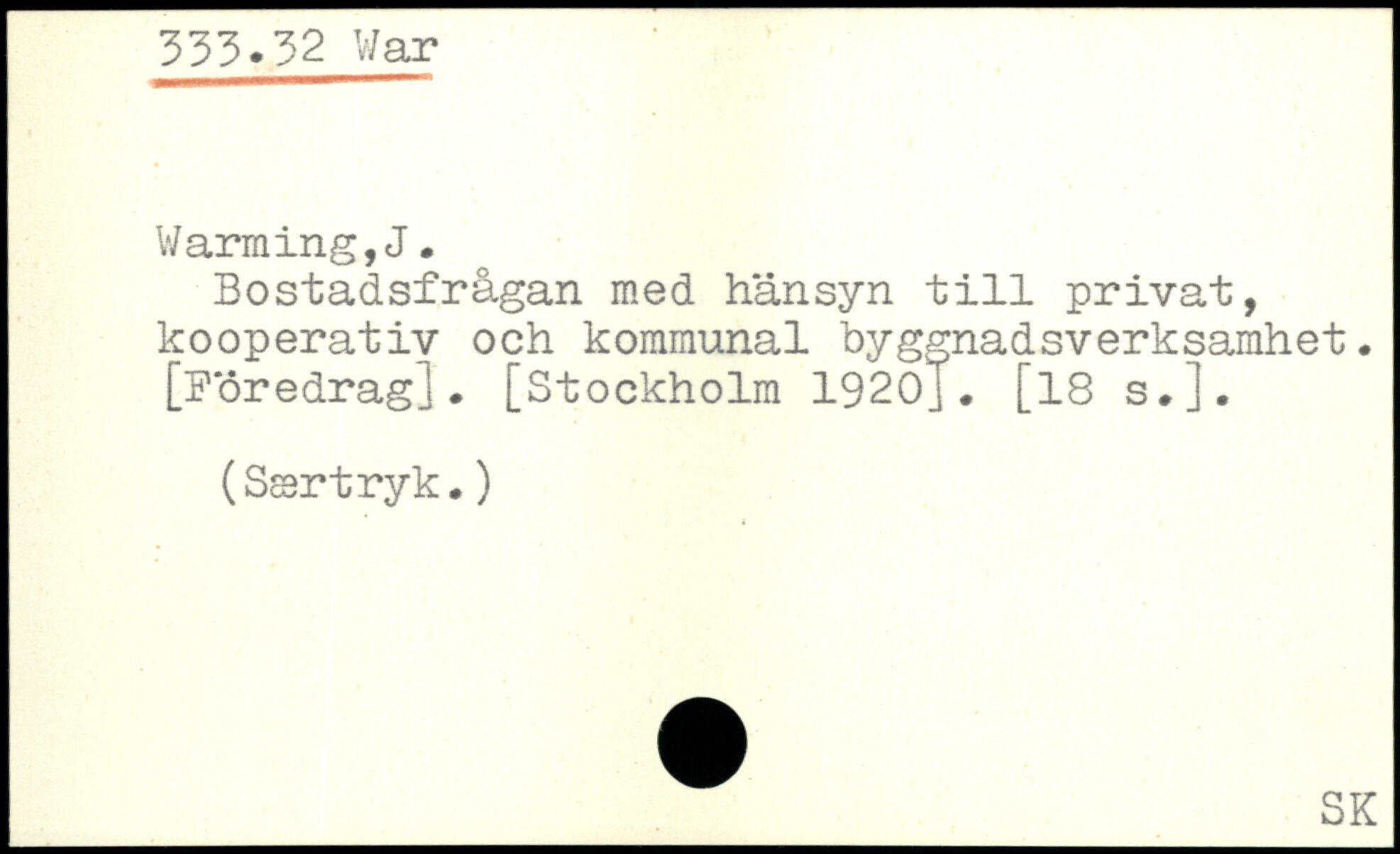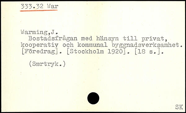 Bostadsfrågan med hänsyn till privat, kooperativ och kommunal byggnadsverksamhet. [Föredrag].