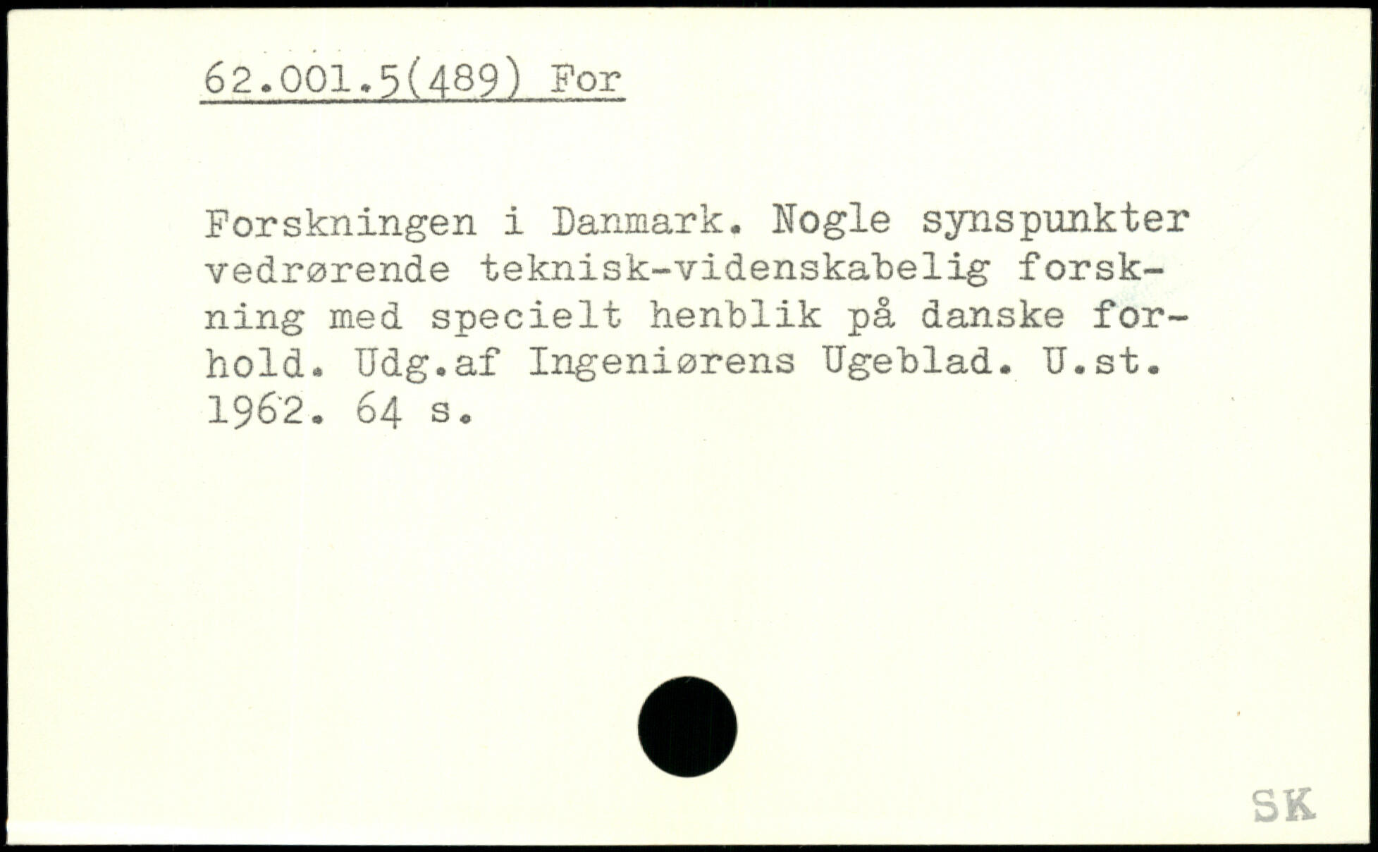 Forskningen i Danmark. Nogle synspunkter vedrørende teknisk-videnskabelig forskning med specielt henblik på danske forhold. Udg.af Ingeniørens Ugeblad. U.st. 1962.