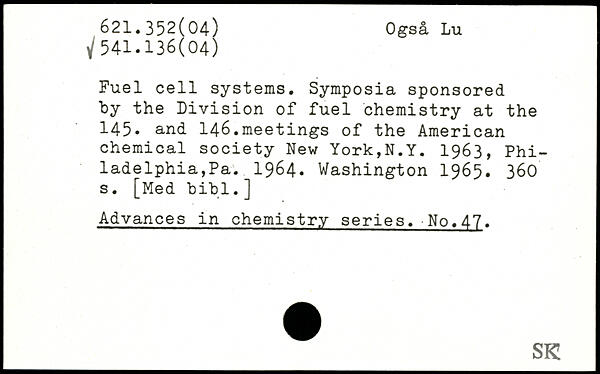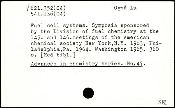 Fuel cell systems. Symposia sponsored by the Division of fuel chemistry at the 145. and 146.meetings of the American chemical society New York,N.Y. 1963, Philadelphia,Pa. 1964.