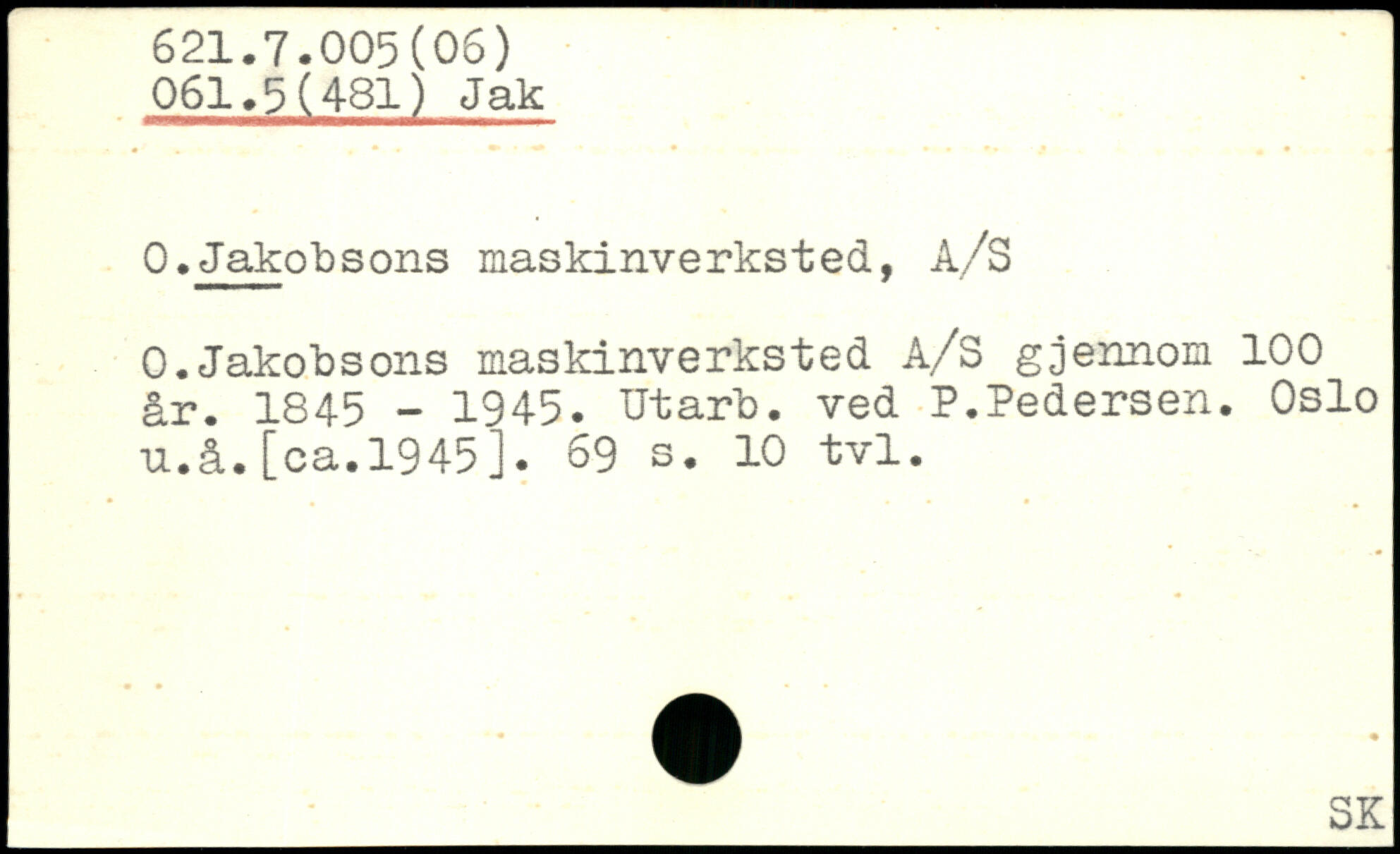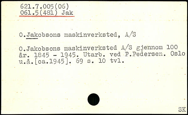 0.Jakobsons maskinverksted, A/S 0.Jakobsons maskinverksted A/S gjennom 100 år. 1845 - 1945. Utarb. ved P.Pedersen. Oslo u.å.[ca.1945j.