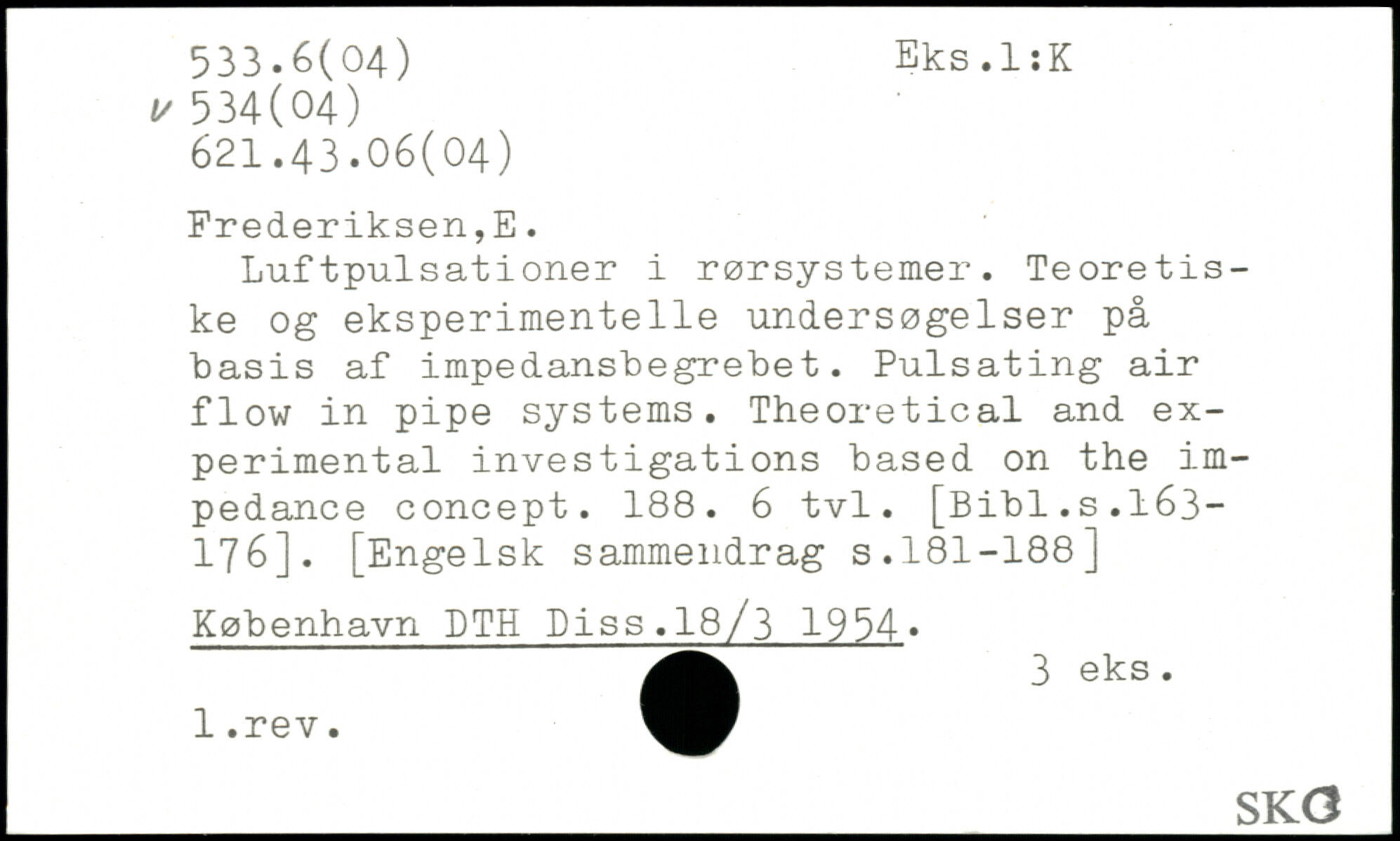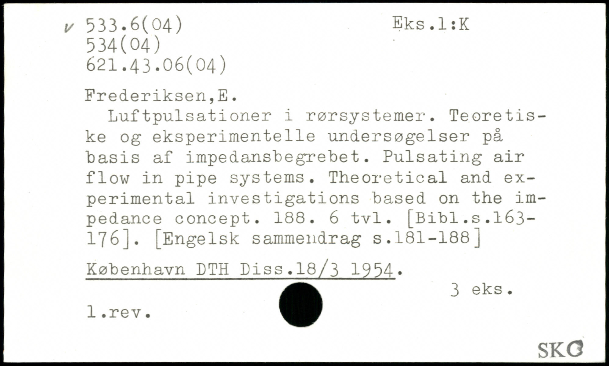 Luftpulsationer i rørsystemer. Teoretiske og eksperimentelle undersøgelser på basis af impedansbegrebet. Pulsating air flow in pipe systems. Theoretical and experimental investigations based on the impedance concept. 188. 6 tvl.