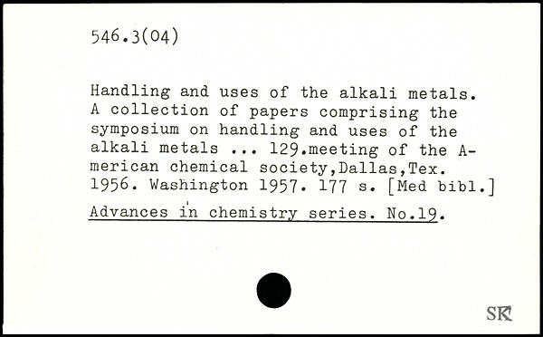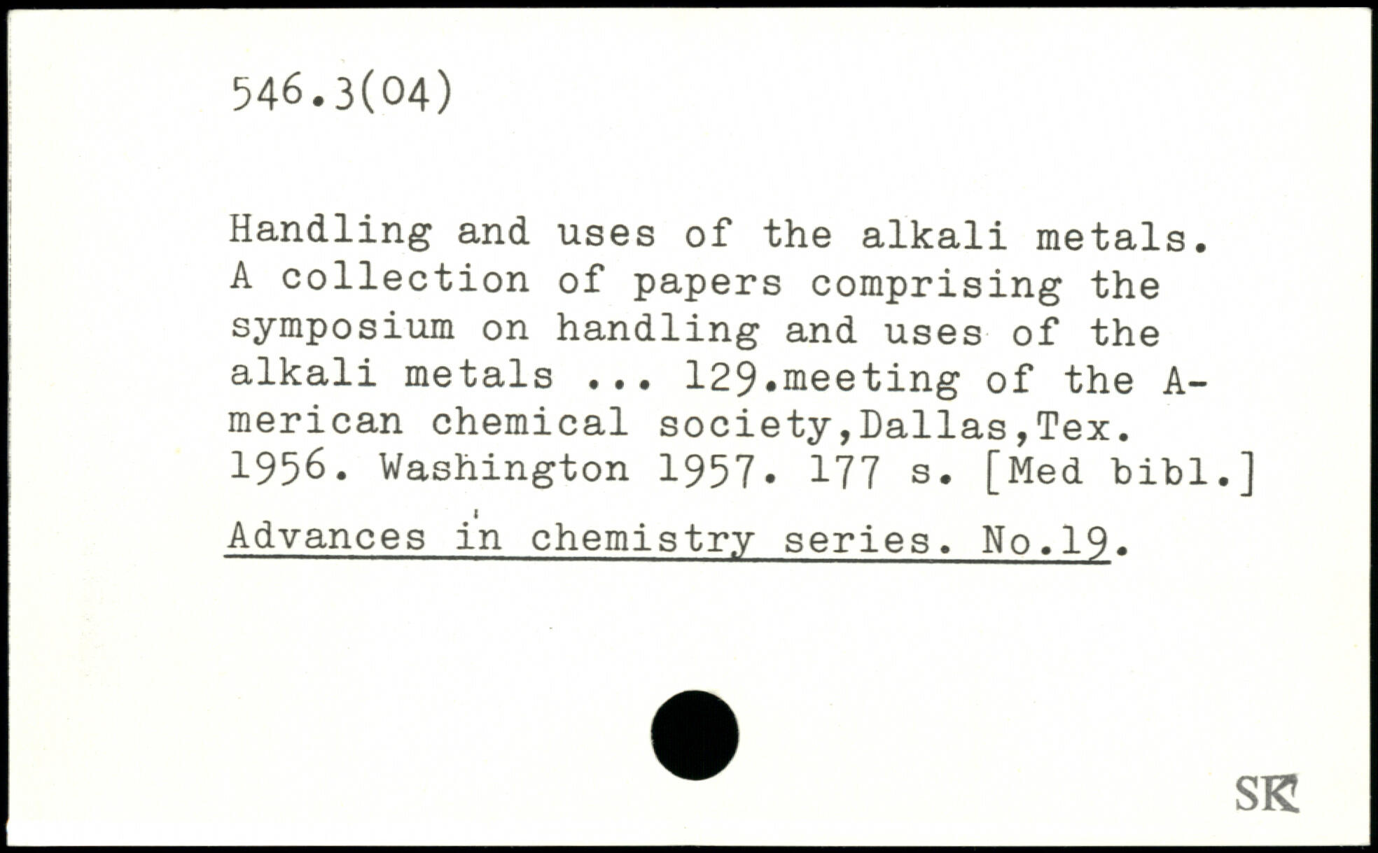 Handling and uses of the alkali metals. A collection of papers comprising the symposium on handling and uses of the alkali metals ... 129.meeting of the A-merican chemical society,Dallas,Tex. 1956.