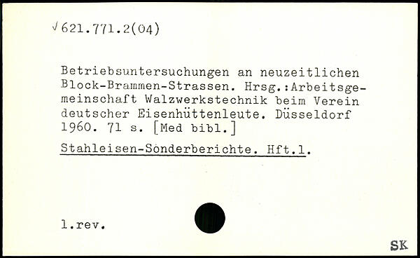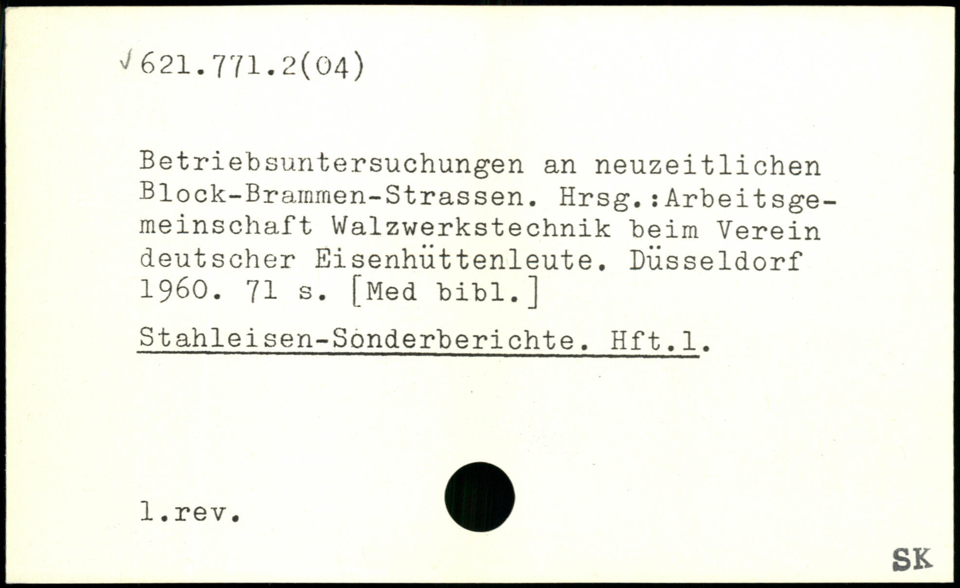Betriebsuntersuchungen an neuzeitlichen Block-Brammen-Strassen. Hrsg.:Arbeitsge-meinschaft Walzwerkstechnik beim Verein deutscher Eisenhüttenleute. Düsseldorf 1960.